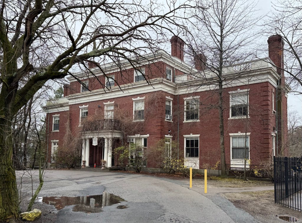 One of the finest estates in Brookline can be found here in the Cottage Farm neighborhood, just steps from Boston and the Charles River. This brick mansion was built in 1902 for Frederick Perry Fish (1855-1930), a prominent lawyer who also served as president of American Telephone & Telegraph Corporation from 1901 to 1907. One of the leading patent attorneys of his age, representing such clients as Alexander Graham BellThomas Edison, and The Wright Brothers, by the time of his death he was believed to have appeared in more patent cases at the Supreme Court than any other lawyer. For his Brookline residence, Fish purchased an 1867 brick mansard-roofed home on the lot and hired the architectural firm of Winslow & Bigelow to ether modify the earlier home or demolish it and build entirely new. The result is this stately, three-story Neo-Classical mansion. Fish would die at his home in 1930, and the property would eventually be owned by the New England Hebrew Academy as a Jewish day school. While it is an institutional use, the facade is covered with climbing vines that are bad for the masonry and an asphalt paved front yard which detracts from the beauty of this estate. It appears to be near-original though, which is great to see!