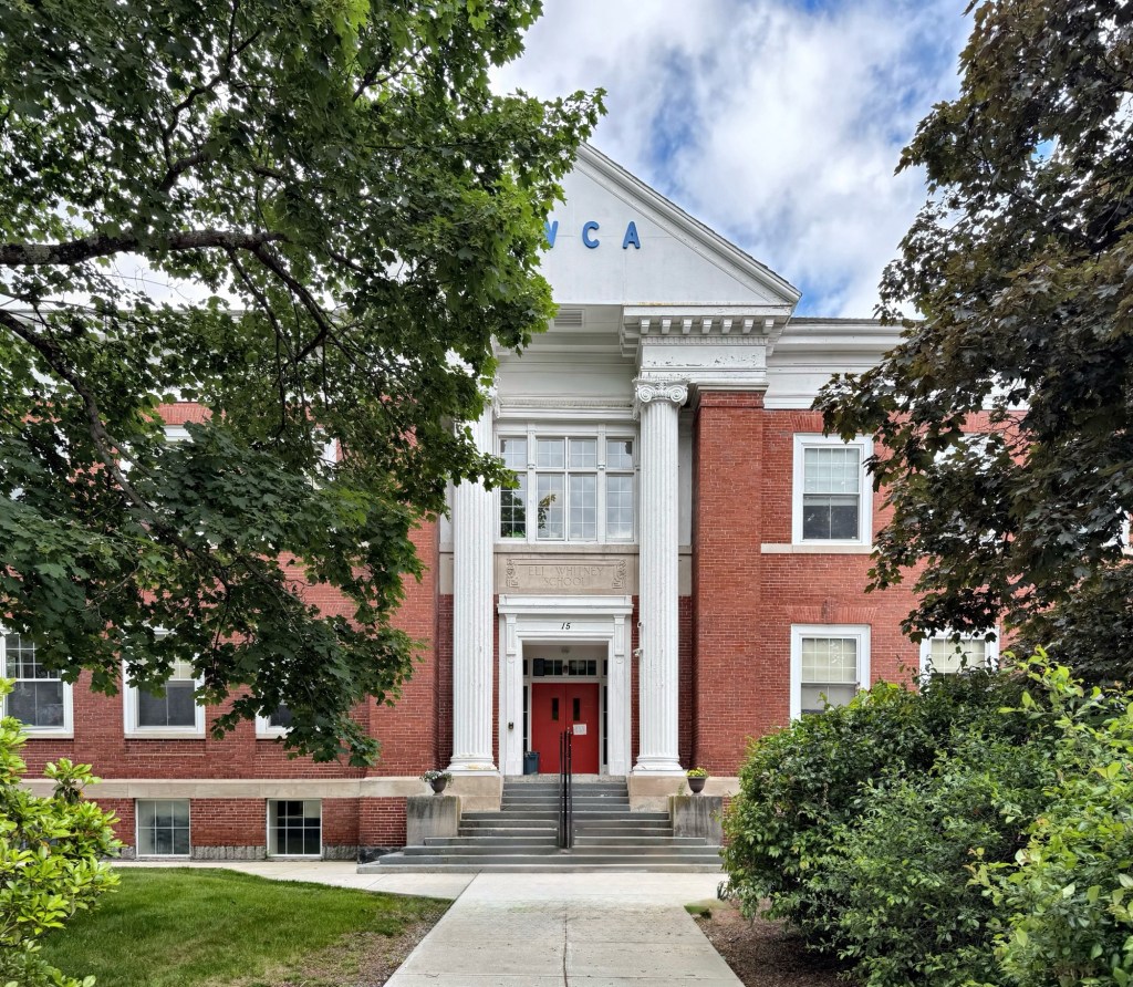 Built a few decades after and located behind the Harvey School in Westborough, Massachusetts, the former Eli Whitney School is a landmark example of an educational building designed in the Neo-Classical style. Built between 1906-7, the school building replaced an earlier school on the site that was outgrown and outdated. Designed by architects Cooper & Bailey, the building stands two-stories tall with a central pedimented pavillion containing the entry that is framed by monumental fluted columns. The school was named after Eli Whitney, the famous American inventor, born in Westborough, who is widely known for inventing the cotton gin in 1793, one of the key inventions of the Industrial Revolution, and later moving to New Haven and manufacturing weapons. When Westborough schools consolidated into modern facilities in the second half of the 20th century, this building was then occupied by the YWCA, and have rented the facilities from the town until it was purchased in 2000.