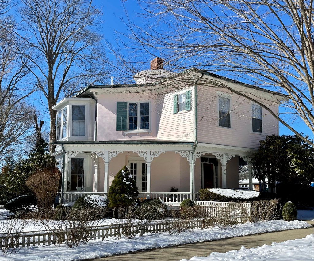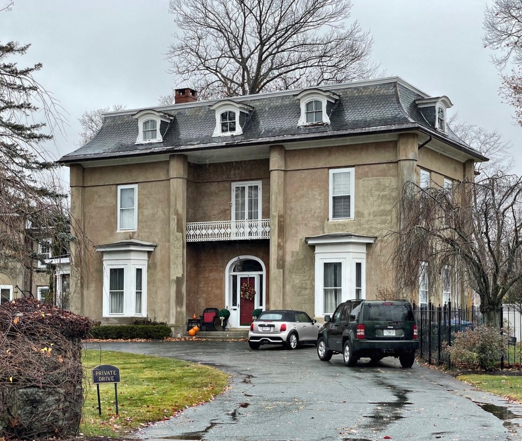 This large house sits on Peabody Avenue in Danvers, Massachusetts, and is thought to be the oldest house built of cement in the United States! Joshua Sylvester Silvester (1803-1888), the house’s original owner, was born in Wiscasset, Maine, and began working in the shoemaking business, expanding his products in England, taking many business trips there. While in England, he is said to have particularly admired Charles Dickens’s estate, Gad’s Hill, and modeled his Danvers home after it. Joshua Silvester not only designed this house, but directly supervised its construction which is of hand-poured cement/stucco by two masons imported to town to work on the house. The fifteen-room residence with octagon-shaped barn was complete by 1858. In 1880, the property was purchased by Isaac B. Howe of Clinton, Iowa. Howe was a civil engineer who had helped to lay out the Transcontinental Railroad and had been superintendent of the Iowa division of the Chicago and Northwestern Railroad. Howe died within a year of moving to Danvers,