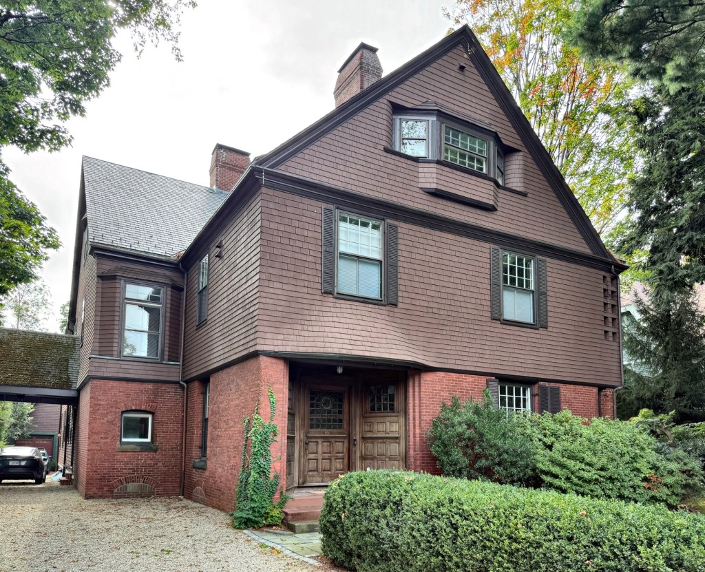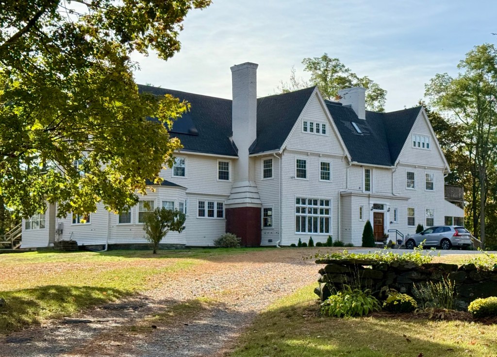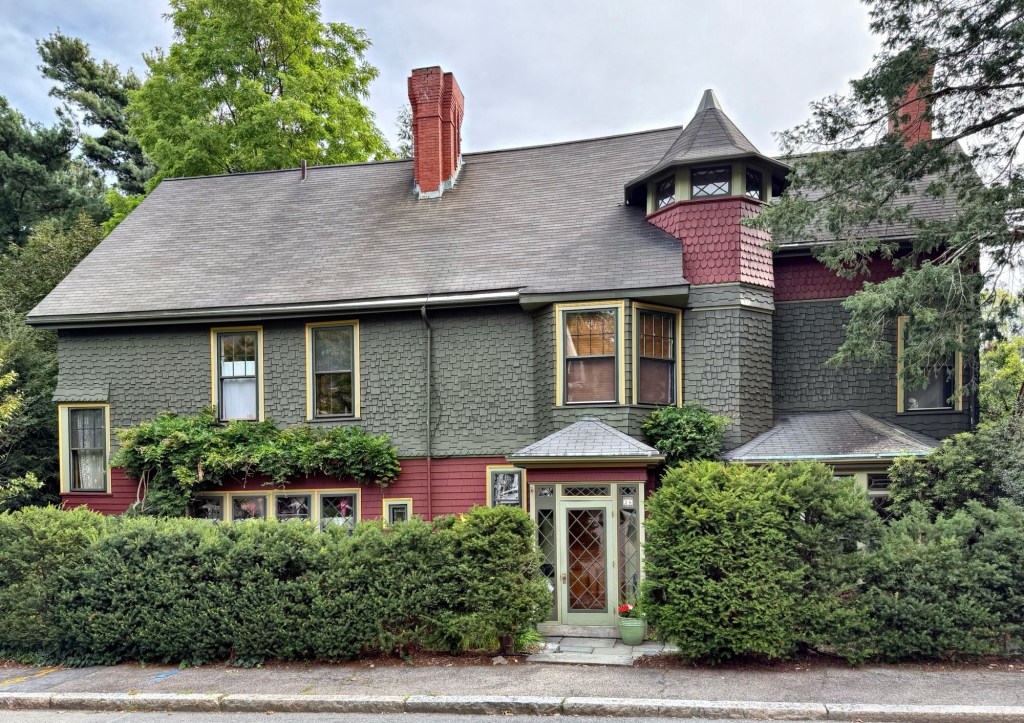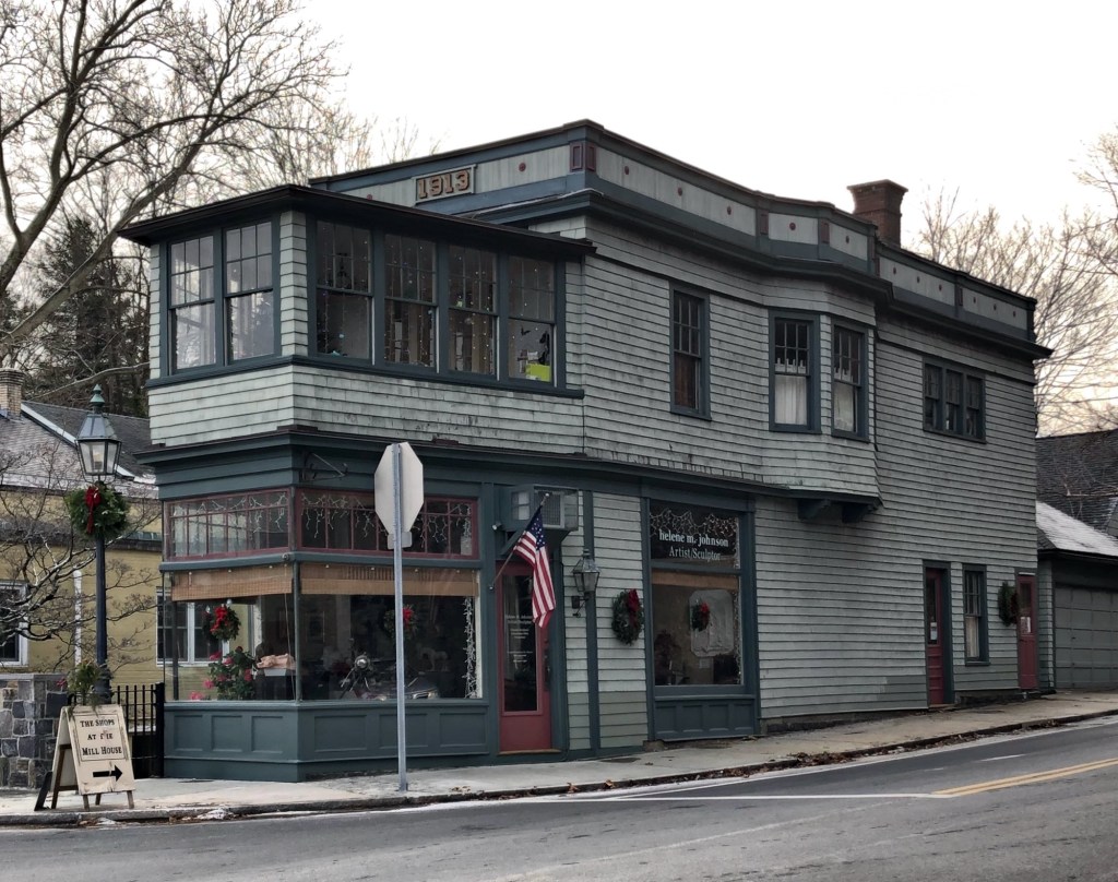 At the junction of West Main and Main Streets in Chester Village, Connecticut, this unique flatiron commercial building stands overlooking the Pattaconk Brook that cuts through the center of town. In 1913, this two-story block was built with ground floor retail and a second floor residence for owner, Elmer Pierce, who ran his pharmacy downstairs. By 1920, the building was owned by Jacob Feinstein, who raised his family on the second floor and had his clothing business, “Feinsteins” in the store below. Later, the retail space was occupied by Child Design, a wooden toy store, and after that, a lighting fixture store. Historic main street buildings are often incubators for small and local businesses, keep the chain stores near the highways!