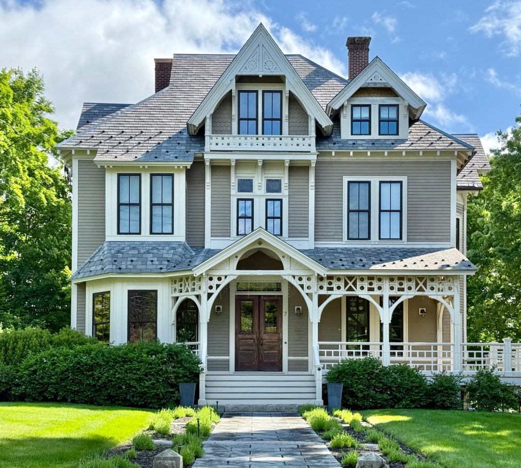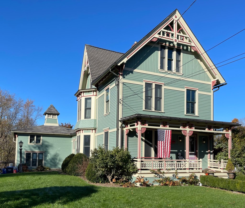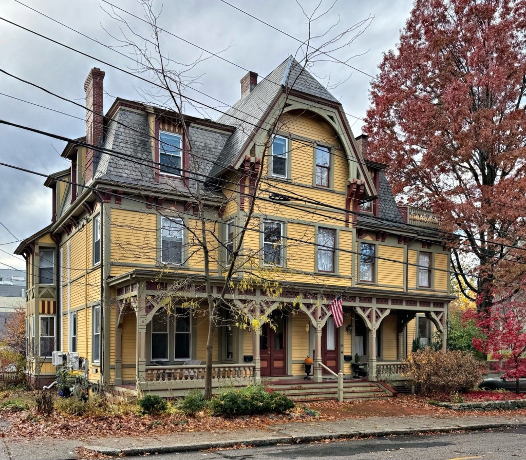 Elijah Carleton Emerson (1807-1888) was a wealthy Boston merchant, making his fortune as Director of the Second National Bank and President of the Middlesex Horse Railroad. In his late 30s, he purchased land in Brookline Village and established his estate on the land that is now Emerson Park in 1846. The bucolic setting of his estate included a pond, boathouse and adjacent cottage, but as the surrounding area continued to develop with easy access to Downtown Boston, Elijah Emerson began to develop his estate. Emerson began to build residences on his land for supplemental income. This handsome Stick style double-house was built around 1880 and rented by Mr. Emerson and was eventually occupied by his granddaughter, Tirzah and her husband, George Francis Arnold. The residence features a mansard roof, decorative brackets and applied stickwork, and a handsome porch with turned posts.