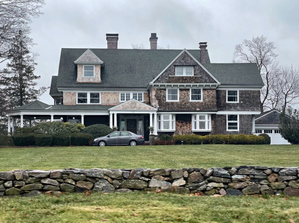 Edward Payson Dutton (1831–1923) was a prominent American book publisher who founded the E. P. Dutton bookselling company in 1852 in Boston, Massachusetts. The business sold fiction and non-fiction, and within a short time expanded into the selling of children’s literature. In 1864, he opened a branch office to sell books in New York City and in 1869 moved his company’s headquarters there and entered the book publishing business. The company did very well, allowing Edward and his wife, Julia the means to build this large summer “cottage” in Ridgefield, Connecticut to escape the rustle and bustle of New York City. The couple purchased the lot in 1893 and appear to have built it soon after. High Ridge Manor is a stunning example of the Queen Anne and Shingle styles of architecture with its asymmetrical plan, continuous shingle siding with rubblestone foundation and chimney, gambrel roof, and towers.