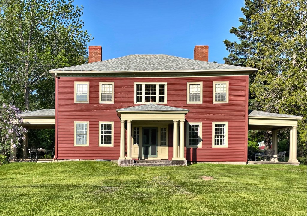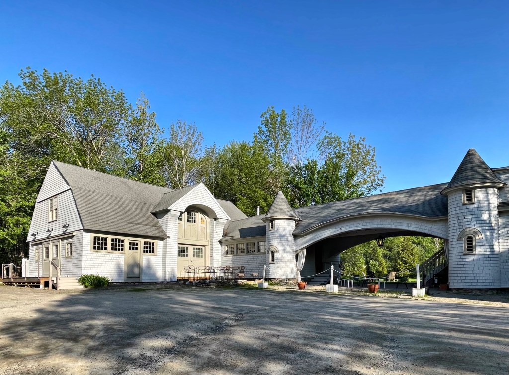 Barncastle, located in the Town of Blue Hill, Maine, is an elaborate and distinctive house. Designed by George A. Clough and built in 1884, the building is a sprawling complex in the Shingle style with additional eccentric details. As Blue Hill and other coastal communities of Down East Maine saw popularity as summer colonies of wealthy city-dwellers flocking to the rugged coastline, many new residents either built new “cottages” or renovated older (often ancestral) homes. Effie Hinckley Ober (1843-1927) who was born in town, married Virgil P. Kline, personal attorney to John D. Rockefeller, and for thirty years worked as attorney for the Standard Oil Co. of Ohio. Effie founded the Boston Ideal Opera Company in 1879 and traveled with the group extensively, retiring in 1885, upon that time, she would move into Barncastle for summers (then named “Ideal Lodge” after her opera company). In 1884, before her retirement, Effie hired her childhood friend, architect George A. Clough, who was born in Blue Hill and worked in Boston, to completely redesign her ancestral home. Clough’s design engulfed a smaller Cape Cod-style house owned by Effie’s mother Mary Peters Hinckley Ober Atherton, a descendant of early Blue Hill settlers, creating an absolutely elegant Shingle-style summer cottage. The house is highly visible on a main street, but what many do not see is the arch-and-turret link between kitchen wing and carriage barn. “Barncastle” is now home to an elegant inn and restaurant!