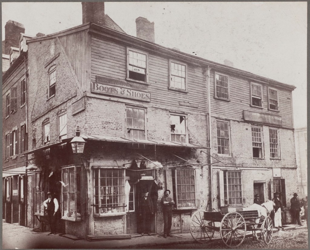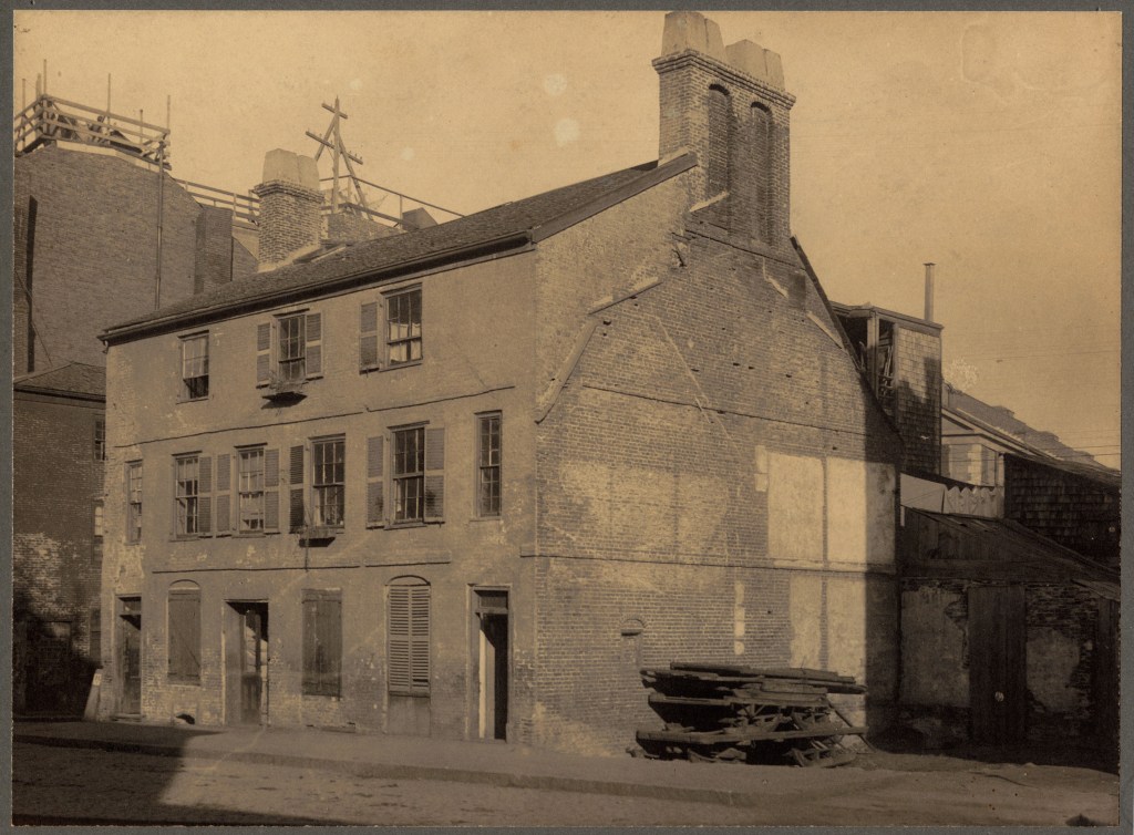 Another of Boston’s Lost buildings is the King’s Head Tavern, an old establishment that was built in the early days of Boston and rebuilt following a fire in 1691. It stood on the corner of Lewis and North Streets, in the North End near Scarlett’s Wharf. Due to its proximity to the harbor and wharfs, it became the first place weary sailors stopped to get a drink on solid ground. The two-story, brick tavern was capped with a gambrel roof, which was later filled with wooden additions giving the structure a boxy look. The establishment was named the King’s Head Tavern after a popular London tavern of the same name. Like much of the North End, surging immigrant populations put immense strain on the built environment and many older buildings were demolished in the late 19th and early 20th centuries for tenement housing. The old King’s Head Tavern was demolished in 1870, just two years after the photo was taken.
