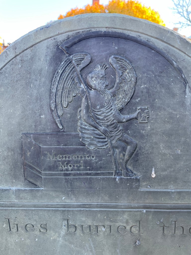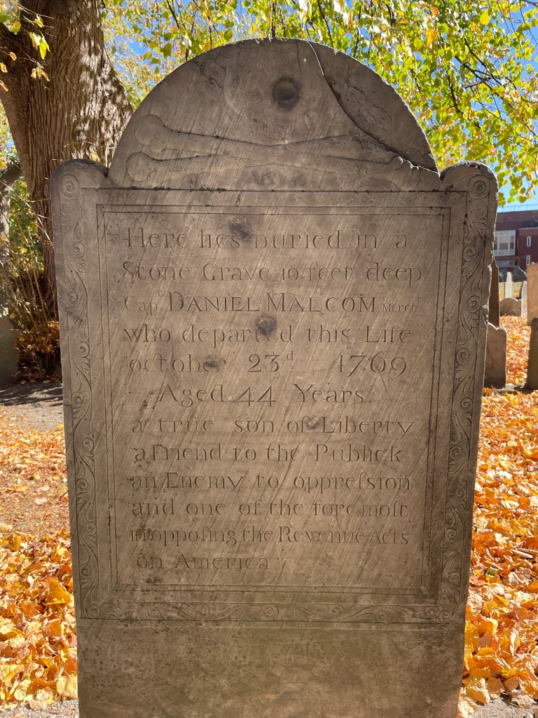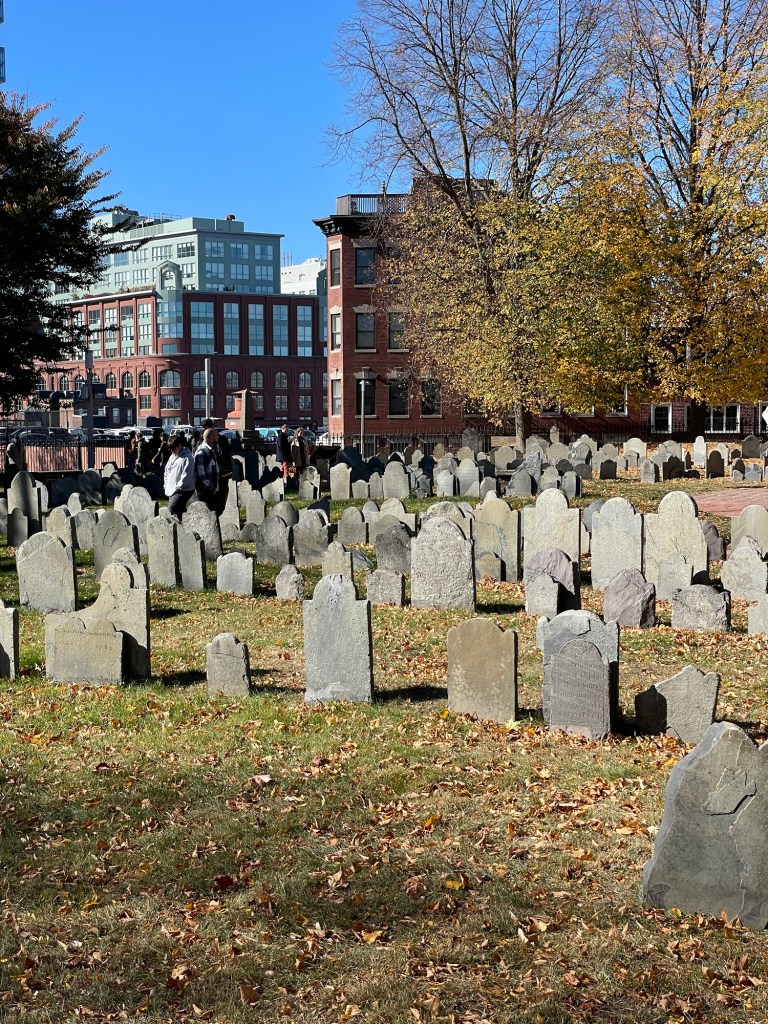 The cemetery is particularly known for its distinct slate gravestones, many adorned with intricate carvings that reflect the artistry of the era. Over the centuries, it has witnessed significant events, including the American Revolution, when it was used as a lookout point for British troops. During the Revolution, the burying ground’s prominent location overlooking the harbor gave it strategic military importance. At its southwest side the British established their North Battery and an earthworks from which they directed the shelling of Bunker Hill and ultimately the torching of Charlestown. Legend has it that British troops used gravestones for target practice. Many have interpreted the round scars on the gravestone of Captain Daniel Malcolm, an ardent son of liberty who spoke against Britain, as the result of musketballs shot at close range. The cemetery was used continually until the 1850s and is today, an evocative reminder of Boston’s early days, drawing visitors who seek to connect with the city’s storied history amidst its tranquil surroundings while the city stretches upwards around it. The cemetery is open and free to visit most of the year and is a great place to stroll and learn about Boston’s early history and see amazing stone carving!