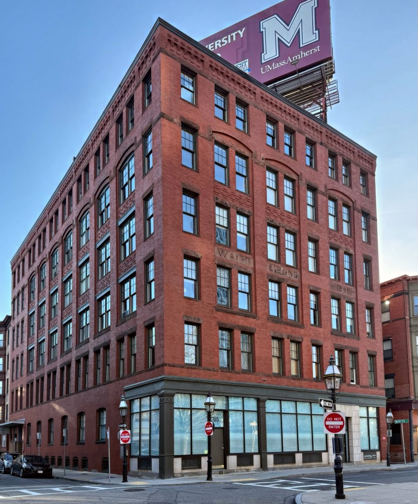 One of several late 19th-century industrial buildings in the North End, the Waitt & Bond Building stands on Endicott Street, looking over the scar on the landscape that is I-93. This six-story building was constructed in 1891 and is the oldest extant building in Boston associated with cigar manufacturers Henry Waitt (1842-1902) and Charles H. Bond (1846-1908), who started business in 1870. The business relocated from Saugus to Boston in 1873 and moved into this building upon its completion. Waitt & Bond produced handmade cigars with each employee hand-rolling over 300-a-day. The architect, Ernest N. Boyden, designed the building in the Panel-Brick and Romanesque styles with decorative brick panels, cornice, and arched detailing. Rooftop billboard signage (blight) was first added to the building in 1956, with increased visibility via the elevated John Fitzgerald Expressway (the Central Artery). By the early 1960s, Joseph Castignetti moved his men’s clothing store, Castignetti Brothers, to this location. In 2001, the building was converted into 28 loft-style condos, an early sign of the gentrification to come to the North End.