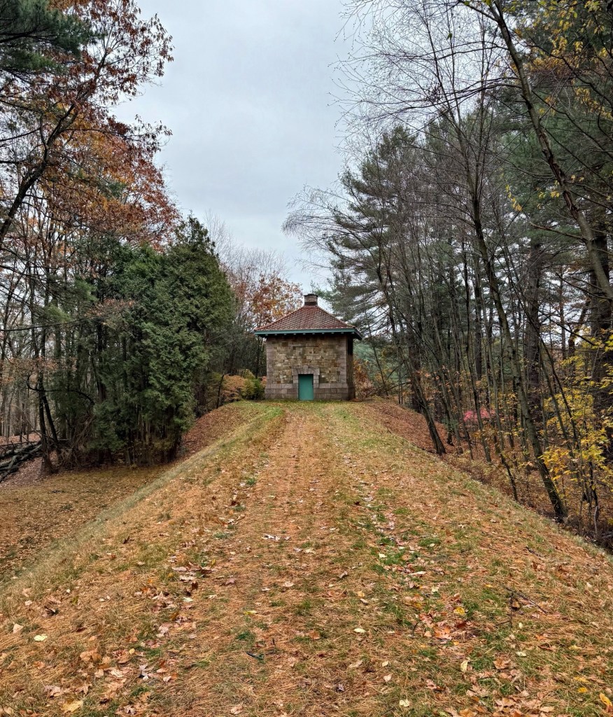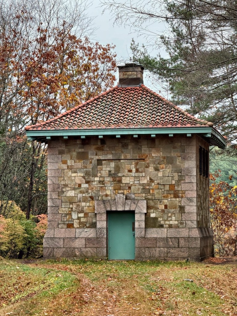 The Weston Aqueduct was designed to deliver water from the Sudbury Reservoir in Framingham to the Weston Reservoir in Weston, Massachusetts. Built between 1901 and 1903, the aqueduct was designed to provide water to the suburbs north of Boston. All of the buildings that shelter the aqueducts above-ground elements, including this structure in Wayland, were designed by the architectural firm of  Shepley, Rutan and Coolidge, with landscaping along the route and at the reservoir designed by the Olmsted Brothers, landscape architects. This siphon house, known as the Happy Hollow Siphon House was built in 1903 and was an important part of the aqueduct system, as it transferred water through varied elevations using gravity and pressure to move the liquid without a pump. The aqueduct route is now a long, linear path and remains owned by the Massachusetts Water Resource Authority.