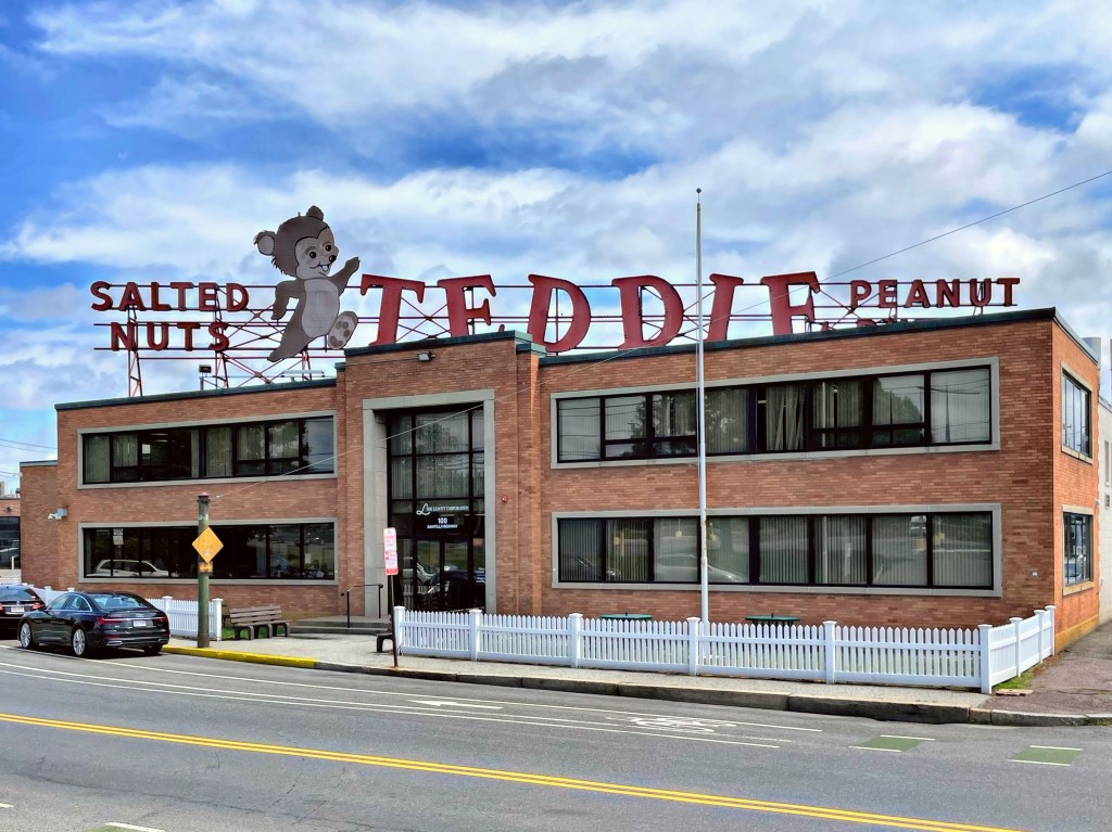 One of the most iconic buildings in Everett, Massachusetts is the “Teddie Peanut Butter” building, in the brewery/distillery district of the city (home to Night Shift Brewery, Bone Up Brewing Company, and Short Path Distillery). The building is best-defined for its massive Mid-Century rooftop sign with the cute teddy bear. The building was constructed by the Leavitt Peanut Butter Company in 1958, but the company had its beginnings nearly a half-century earlier. The Leavitt Corporation had its beginnings in 1897 when Sarkis Shaghalian, a European immigrant, started manufacturing candy and roasted nuts in Boston. In 1916, Michael Hintlian took over the company and in 1925, established a separate corporate entity specializing in peanut and nut products, the John W. Leavitt Company. The company did extremely well in its Boston location, eventually outgrowing their State Street buildings. In 1959, the company hired an industrial realtor, who found the Everett facility – a recently constructed building with Modern finishes and design. In 1959, Leavitt Corp. signed a lease and moved in by 1960, adding the rooftop sign at that time. The sign used to have neon strips, but was eventually removed.