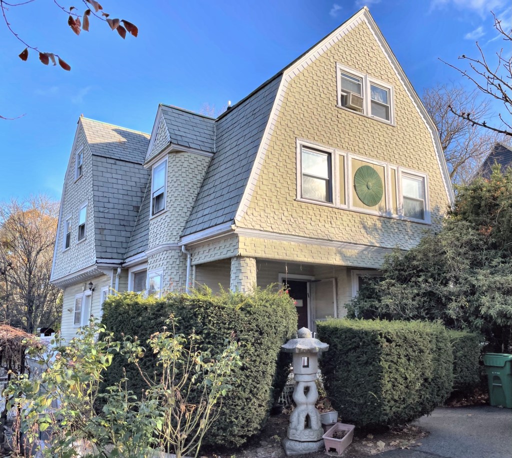 I do not think that I have ever seen rounded shingled columns like this before… What a treat! This house is located on Rice Street in Newton Centre, and was built in 1890 by Henry H. Read, a leather dealer who developed the entire street. This house was built on speculation and initially rented out to tenants before it was sold to Frank Ratcliffe and his wife, Elizabeth Ratcliffe. Frank Ratcliffe was born in England and would become treasurer of the Boston & Albany Railroad, which had a stop in Newton Centre. Frank and Elizabeth would sell or gift this property to their daughter, Mary Elizabeth Ratcliffe Holt and her husband, Warner R. Holt. Besides the unique shingled columns, the house features a broad gambrel roof and sunburst panels and a two-story rounded shingled bay. I could not locate the architect for this one, sadly.