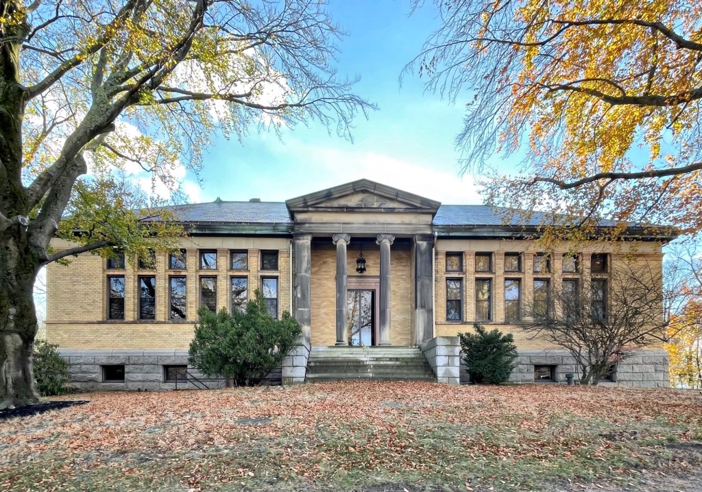 The Hills Library is a formal building standing at the summit of Institution Hill, so-named as the home of the Newton Theological Institution (and most recently as the Andover Newton Theological School). The library was constructed in 1895 from plans by architects Henry H. Kendall and Edward F. Stevens of the firm, Kendall & Stevens. Designed in 1894 in the Neo-Classical style, the library has a stately portico in the Ionic order with a pediment above. The building is constructed of yellow brick with stone and terracotta trimmings with banks of vertical windows. The library would be added onto at the rear, with the main entrance later closed for an accessible entrance in a rear addition. The building is now known as the Hanns Sachs Memorial Library for the current owners and stewards, the Boston Psychoanalytic Society & Institute (BPSI).