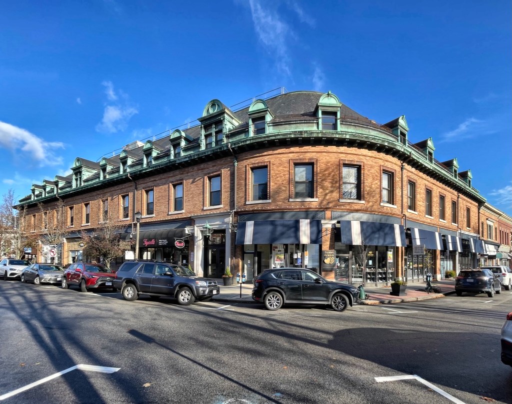 As Newton Centre’s new railroad station and following development boom transformed the once sleepy village into the main commercial center for the city, landowners capitalized on the opportunity by developing commercial blocks to serve the community and line their own pockets. Mellen Newton Bray (1856-1946) became a major landholder in Newton Centre and would develop the areas directly surrounding the new train station there. On a curving site, he built Bray’s Hall, this three-story commercial block renting out spaces to local banks and stores with a large assembly hall and bowling alley in the building as well. Initially, Bray planned for an eight-story structure, having contracted a solid foundation that could support such a structure, pending the success of the initial construction. That is mixed use before it was “cool”. The building was designed by the firm of Kendall & Stevens, likely led by Henry H. Kendall, who resided in Newton Centre. Kendall would also design the apartment block across the street for Mr. Bray. The building is constructed of light Tuscan bricks and is notable for the bracketed cornice and dormers all in copper. The building was restored in the 1970s by owner David Zussman, and rebranded as Piccadilly Square, following his recent trip to London being impressed with by the atmosphere of Piccadilly Circus.