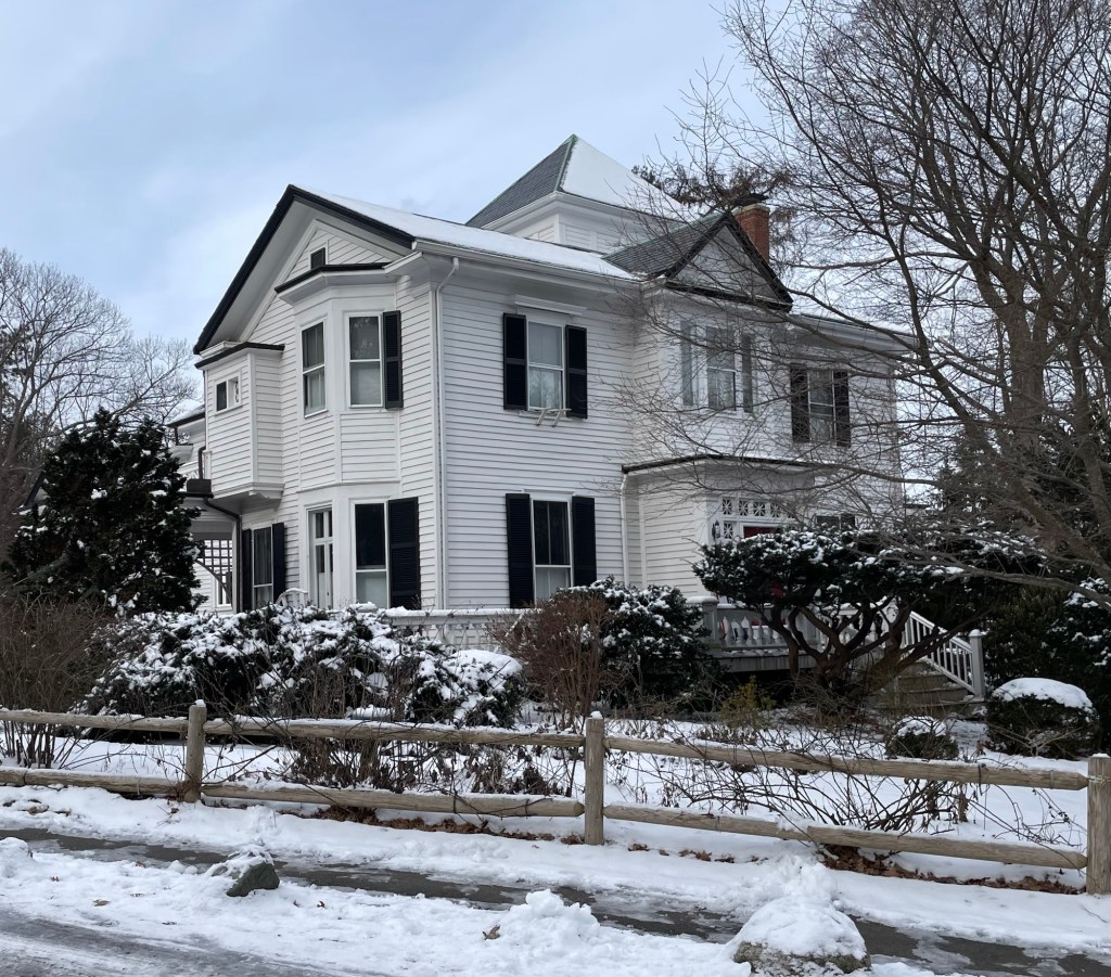 Andrew F. Leatherbee (1842-1920), a wealthy lumber dealer in Boston, built this large Stick style victorian house in Newton Center around 1870, likely using his own lumber products! The large frame house is prominently sited on a corner lot on Beacon Street, a short walk to Crystal Lake, a natural pond in the center of town. I could not find information as to who the architect was, but it was likely a notable local firm. As Andrew got older, he downsized and relocated to a smaller apartment in Cambridge. Upon his death in 1920, the property was sold by his heirs to Mae Van Dusen. The house is a high-style example of the Stick style of architecture, with large half-timbers, heavy porch bracing, and a central tower with pyramidal roof. Swoon!!!