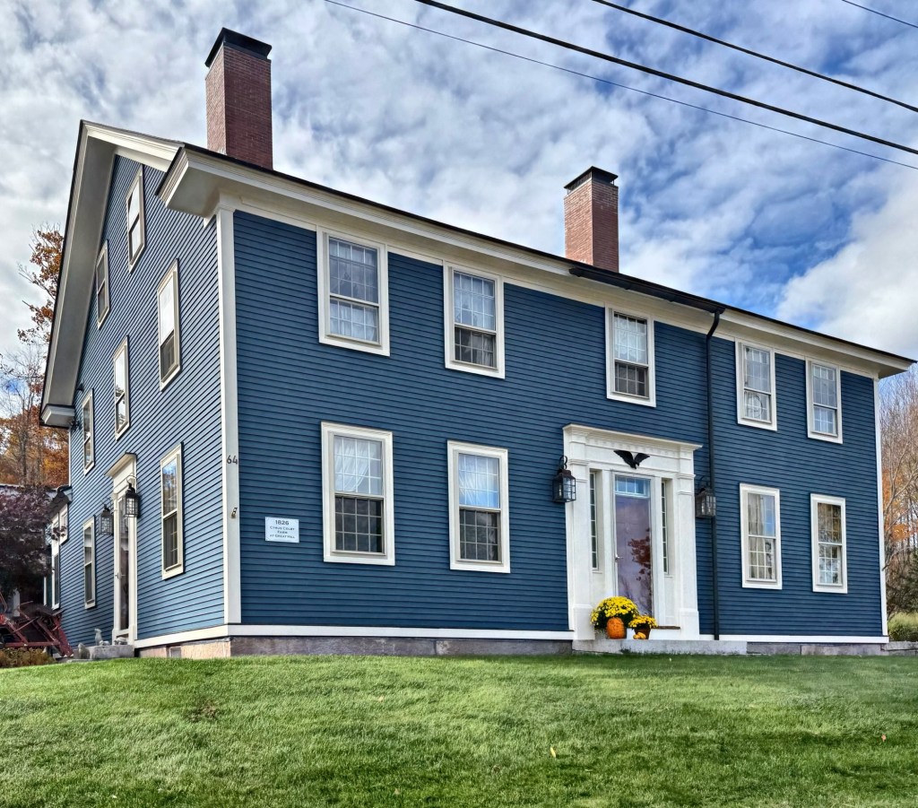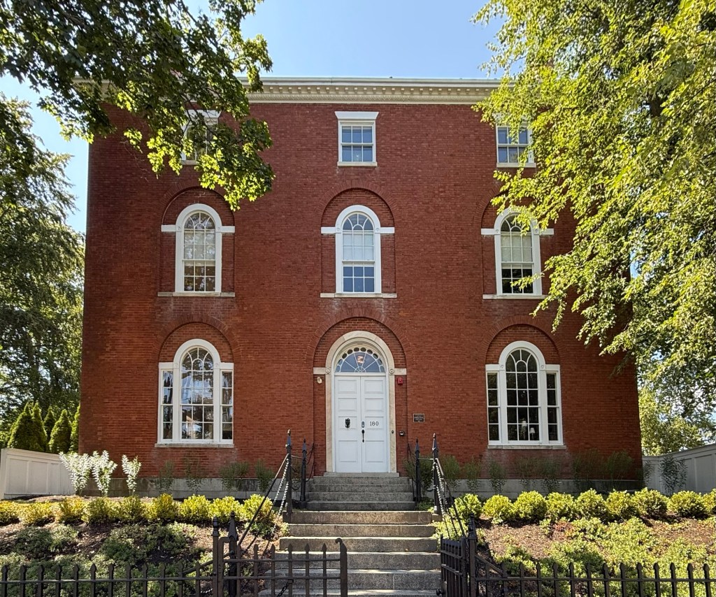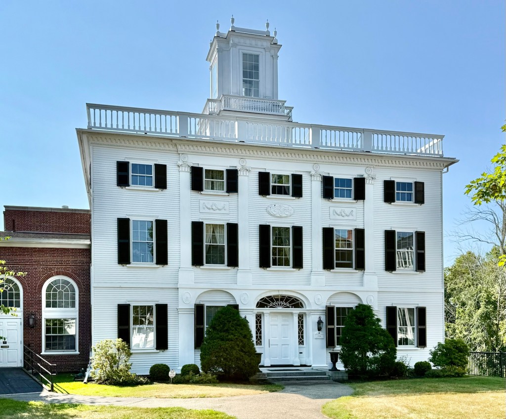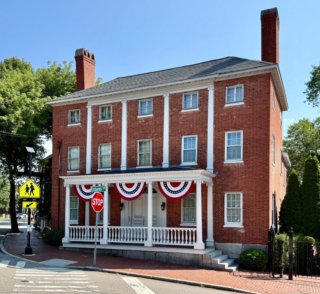 The Larkin-Ladd House at 180 Middle Street in Portsmouth, New Hampshire, is a three-story, masonry Federal-style residence with symmetrical facade, built for one of the city’s wealthiest merchants. Samuel Larkin (1773-1849) was born in Charlestown and moved to Portsmouth, marrying Ann Jaffrey Wentworth, a daughter of Col. Joshua Wentworth. During the War of 1812, Samuel Larkin made his fortune as an auctioneer, selling the contents of English ships captured by local privateers. It is believed that fourteen privateers and their crews worked out of Portsmouth Harbor and are said to have captured an estimated 419 British ships! With the profits from stolen goods from these British ships, Larkin purchased lots on Middle Street and began construction of this stately residence. He (and mostly his wife), had twenty-two children, although roughly half of them died before reaching adulthood. By the late 1820s, financial hardship fell on Larkin and he sold this property, moving into his house next door, which before this was his original residence and later rented to boarders. The Federal style mansion was later owned by Henry H. Ladd, a prosperous Portsmouth shipping merchant, who also served as President of New Hampshire Bank and Portsmouth Savings Bank. The Larkin-Ladd House is undoubtedly one of the finest Federal style residences in New England, and stands out for its entrance, flanked by Palladian windows and the slightly recessed elliptical surrounds at the first and second floor windows. Additionally, the historic stable, also from the 1810s, maintains much of its architectural integrity.