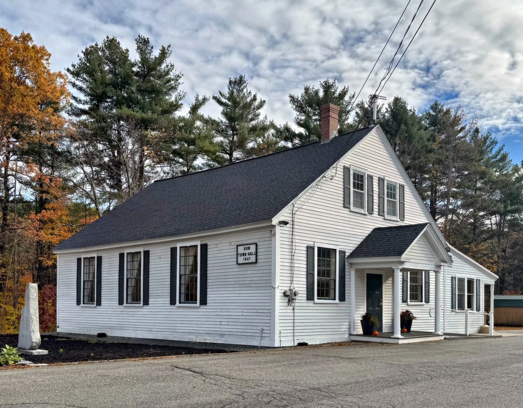 The town of Bow, New Hampshire, was incorporated in 1727 and named after its location along a bend, or “bow” in the Merrimack River at its easternmost boundary. Early town meetings were held in the town meetinghouse of 1770, and the second meetinghouse of 1801, until the separation of church and state became official in New Hampshire in 1819, with the passage of the Toleration Act. Until 1819, residents in New Hampshire conducted town business and religious services in the same building, the town meetinghouse. However, as towns diversified and religious freedom prospered, citizens grew less comfortable supporting one particular religious denomination with taxpayer money. Bow eventually secured funding to erect its first purpose-built town hall in 1847, this vernacular, two-story building on Bow Center Road. The small building served as the town hall for over 100 years, when in 1957, a growing suburban population required a larger, more modern town hall. The old Town Hall of Bow now serves as a meeting place for Town organizations and is rented out to Town residents for events.