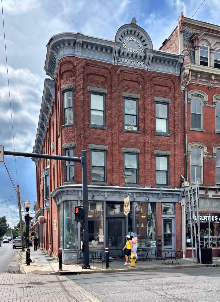 Built at the corner of Main and Partition streets in Saugerties, New York, this handsome 19th century commercial building is located next door to the Whitaker Block – featured previously. The Van Buskirk Block was built in 1895 for the Van Buskirk Brothers, who were pharmacists in town. The building has a unique rounded corner, inset brick paneling, and a bold metal cornice at the roof.