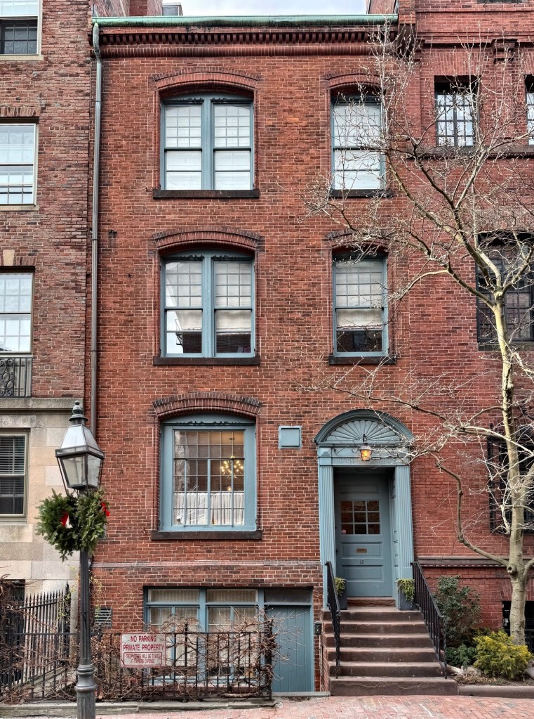 These three identical three-story houses at 156, 158 & 160 Mt. Vernon Street in Beacon Hill Flat were built in 1871 as income producing properties for Samuel and Emily Otis Eliot who lived next door on the corner of Brimmer Street. The architect is not evident from my research, but they were likely designed by Abel C. Martin, who furnished speculative housing for the Eliot’s elsewhere in the neighborhood. All three residences feature brick facades with off-center recessed entries on raised stoops. The use of brownstone lintels and sills, decorative brick cornice, and second-story hexagonal oriel windows add intrigue to the design, along with the slate mansard roofs. The three houses were sold or rented and all were owned by various families, but notable owners of the central house include the architect George Russell Shaw (1848-1937) of the firm Shaw and Hunnewell through the early 1900s. Later in the 20th century, the house was owned by Kevin White (1929-2012), who served as the mayor of Boston for four terms from 1968 to 1984.