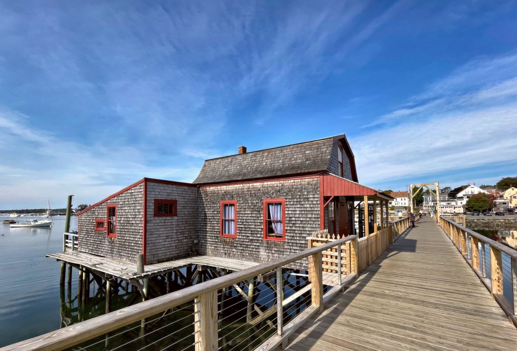 In 1901, a footbridge was built in Boothbay Harbor, Maine, connecting the downtown area with the Mt. Pisgah and Spruce Point areas, which both developed as summer colonies. Within a year, this bridge house was built and occupied by William Foster, the bridge-tender who likely operated some sort of swing to allow vessels to pass by until the footbridge was largely replaced after the Great Freeze of 1918, without a swing or draw. When Mr. Foster operated the footbridge, others in town suspected some wrongdoing. A local selectman began investigating and as the story goes, Mr. Foster had been smuggling liquor into town via ships to this bridge house through a trap-door in the floor of the building. Maine was a dry state, and William would have been able to bring in illegal alcohol to the town. Later uses of the building included a candy shop, gift shop, and the bridge house is now a private residence, with thousands passing by every summer.