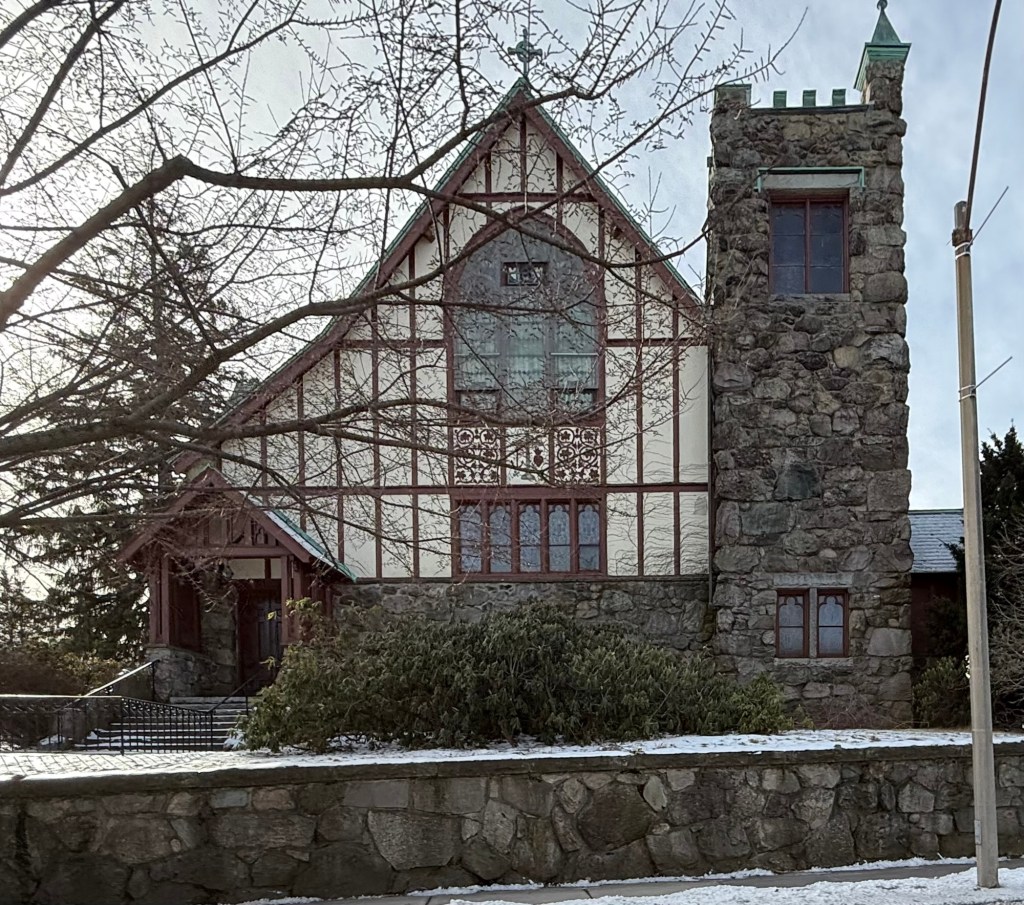 The parish known today as Infant Jesus-St. Lawrence Church was established in 1898, two years after its original chapel building – shown here – was erected to serve as a mission church of St. Mary of the Assumption in Brookline Village. The St. Lawrence Church was built in 1896 on Boylston Street in the Chestnut Hill/South Brookline area of the town, built to serve a more local, well-off population in the area. The church (and the adjacent rectory) was designed by Franz Joseph Untersee, a Swiss-American architect, and Brookline resident, who designed many Roman Catholic churches throughout the eastern part of United States. The Neo-Gothic church building is built of wood and stone with stucco and applied half timbering. Besides the large stained glass window and applied ornament, the church is notable for its square, irregularly-laid granite tower with crenelation. The church remains active in the community and very-well preserved inside and out.