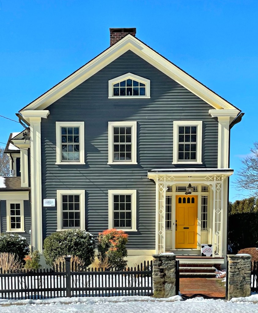 William Bradford (1729-1808), who would become Deputy Governor of Rhode Island from 1775 to 1778, came to Bristol to practice medicine by 1758. When he arrived, he rented Mount Hope Farm (featured before), before building a home in town. When the British Navy bombarded Bristol on October 7, 1775, his home was among the buildings destroyed. He afterward went aboard ship to negotiate a cease fire, saving what was left of the town. In 1792, he built a 2 1/2-story Federal style, boxy house on this lot, close to the street. The home was willed to his son Hersey, who resided there until the 1840s, when he mortgaged the house to Francis Dimond, who resided in a Greek Revival temple front home (also featured on here previously). He gifted the modest Federal home to his daughter, Isabella, possibly as a wedding gift upon her marriage to Samuel Norris, a sugar refiner. Mr. Norris and Isabella hired architect Russell Warren, who designed her father’s home nearby, to renovate the house in the spring of 1845, moving the house away from Hope Street. The house was given its third floor and additional bay, along with the ornate design which characterizes it to this day, including the Ionic porch and Chinese Chippendale balustrade. The house remained in the Norris family until 1942 and is now a B&B.