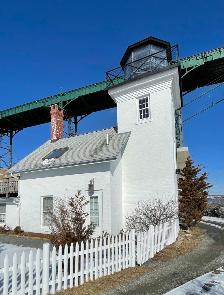 The Bristol Ferry Lighthouse, located on the southernmost tip of Bristol, Rhode Island, is possibly the most difficult building I have tried to photograph since starting this account. The lighthouse got its start in 1846, when the Bay State Steamboat Company, established a small lighted beacon at this location. The Fall River Line consisted of a railroad journey between Boston and Fall River, Massachusetts, where passengers would then board steamboats for the journey through Narragansett Bay and Long Island Sound to a dock in Manhattan. For many years, it was the preferred route to take for travel between the Boston and New York. The early beacon was unreliable, and Congress appropriated $1,500 in 1854, for a combined lighthouse and lightkeeper dwelling. The light served this chokepoint well, until the construction of the Mount Hope Bridge between Bristol and Portsmouth in 1928-1929. Spanning over a mile long, the bridge was built practically over the lighthouse and rendered it irrelevant as an aid to navigation. The lantern was removed from the tower in 1928. An automatic navigational light on a nearby skeletal tower remained in operation until 1934. Around that time, the lighthouse was sold off as excess and went into private ownership, and for a while, provided housing for a couple students at nearby Roger Williams University. The building was restored and now appears to be a private home.