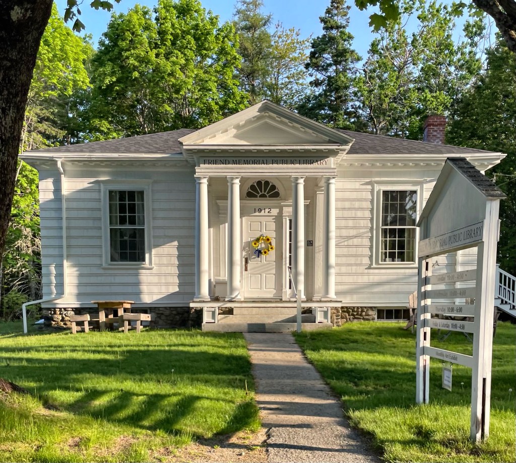The Friend Memorial Public Library in Brooklin, Maine was built in 1912 on land donated three brothers in the Friend family. The brothers, Leslie, Robert and Victor Friend were born in Brooklin, but were raised in Melrose, Massachusetts. There, they made a fortune producing Friend’s Brick Oven Baked Beans. With their new wealth, the brothers had the bright idea of building a roller-skating rink for the enjoyment of the Brooklin community. As the need for a library overtook that of a roller rink, the brothers sought to cement their name in the town’s history by funding a new library building. The previous library was located in a small space in the IOOF Hall nearby (featured previously) and a new, purpose-built space for a library was a desire for the small community. William Nelson Wilkins, an architect of Magnolia, Massachusetts, and husband of Brooklin native Ella McFarland, was hired to furnish plans on the new building which was built in 1912 in the Colonial Revival style. In 1940, Katerine and E.B. White (author and summer resident), Owen Flye and others were instrumental in revitalizing the library, increasing the collections and hours of operations. About ten years ago, the library was restored and renovated inside by Elliott Architects.