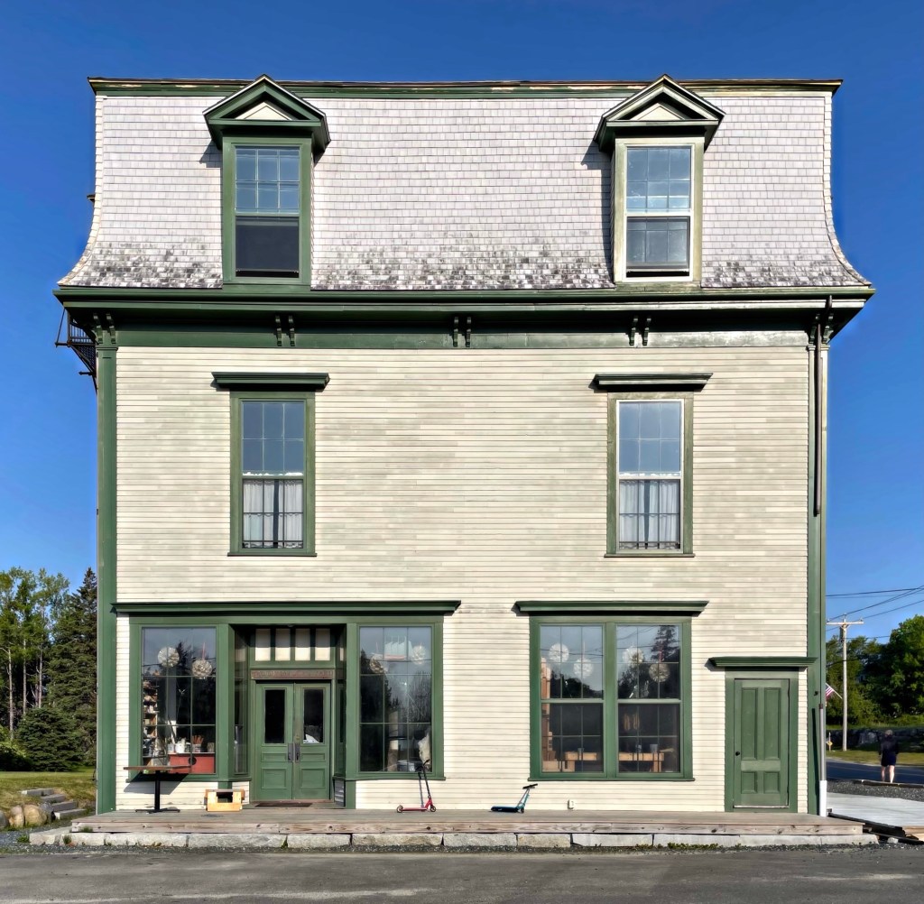 Welcome to Brooklin, Maine! Constructed in 1896 by local builder Ralph E. Bent, the coastal town’s I.O.O.F. Hall is one of Brooklin’s largest and most architecturally significant nineteenth century buildings. The Independent Order of Odd Fellows is a historic and long-running (somewhat secret) fraternal organization which has branches all over the world. In Brooklin, this building was designed to accommodate commercial uses on the first floor, community functions and theatrical productions on the second floor and lodge meetings in the upper/mansard story. The building saw disinvestment by the turn of the 21st century, and by the time the building came on the market in 2017, the hall had languished for years, and the structure was in a serious state of disrepair. The building needed new plumbing and electrical wiring, a new foundation and roof, foundation repairs, and heat; its roughly $270,000 price tag reflected the amount of work it would need to be rehabilitated. John Ike, an esteemed architect, and frequent visitor to Brooklin, formerly of Ike Kligerman Barkley and now of Ike Baker Velten, had long been enamored by the decaying building, and felt compelled to act. With his two friends, Robert Baird and Steve White, the trio restored the old building which continues its connection to the small town’s history and became a vibrant contributor to its present. The upstairs space can be rented short-term, which helps sustain the maintenance of the old building.