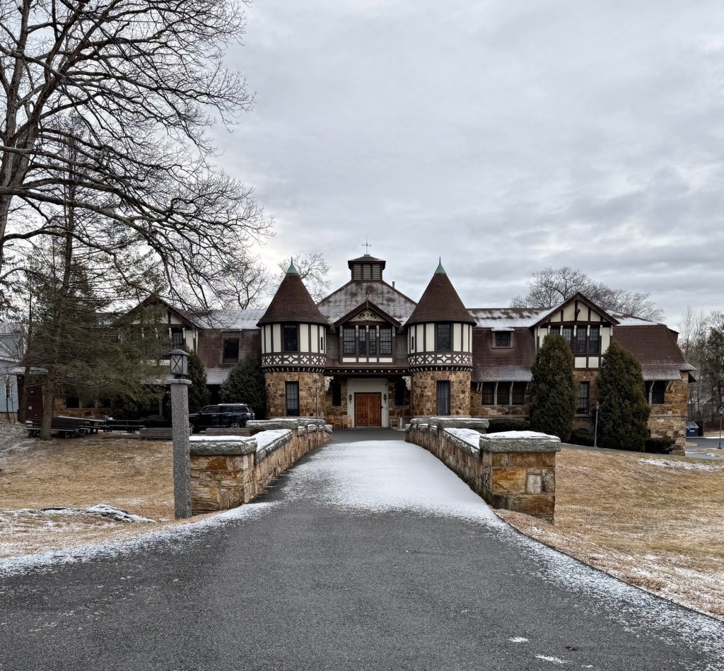 Located next to his Tudor Revival style mansion, Eben Sumner Draper’s stable on Adin Street in Hopedale, Massachusetts, is one of the finest examples of the type in New England. It is possibly that the stable was built before the mansion was built in 1926 for Eben Sumner Draper Jr. (1893-1959), the son of Massachusetts Governor and Draper Corporation executive, Eben Sumner Draper. Little is known about this building, which stands at the end of a drive and is accessed over an arched bridgeway. The building has its first floor in stone with half timbering above. Two rounded towers with conical roofs frame the center entry, which may have been used for horses and carriage, or for personal automobiles, of which, Mr. Draper would surely have one of the first in the state. The building has been owned by the Ledges LLC, who operated a community for developmentally disabled adults.