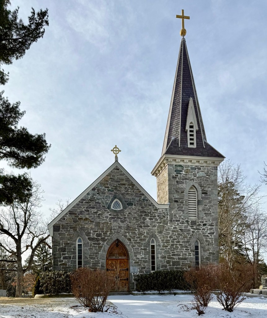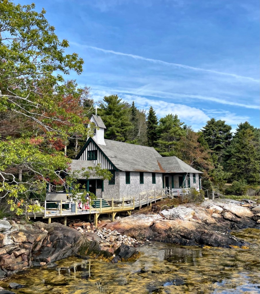 Possibly my favorite type of building in Maine are the historic Episcopal summer chapels that sprouted up along the coast in the late 19th and early 20th centuries. This is the All Saints by-the-Sea Episcopal Church of Southport, Maine, an island community with many summer residents. This church had its beginnings when Reverend John Thomas Magrath of Gardiner, Maine, would visit Southport in the summers and hold services for rusticators under the oak trees or in the cottage living room if the weather was poor. Eventually, a member of the congregation purchased a lot on the east side of Southport on the rugged coastline, and planning began for a chapel. In 1905, the chapel was designed by architect, Albert Hall in a rustic blending of the Shingle and Tudor styles. The building exhibits shingle siding with half-timbering, the original diamond-pane windows, and a large entry porch off the entrance.