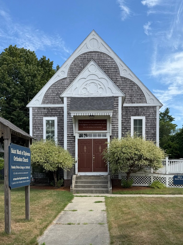Built in 1882 as a Catholic mission church, the St. Mark’s Orthodox Church on Main Street in Kingston, Massachusetts, stands as a lovely example of a Victorian Gothic ecclesiastical building in a great state of preservation. In the waning decades of the 19th century, the Irish and Catholic population of Kingston grew, which led members to petition the Diocese to erect a mission church closer to their homes, rather than attend St. Peter’s in Plymouth. Originally called St. Joseph’s Church, the building served the local Catholic population until after the new, brick St. Joseph’s. Church was built further down Main Street in the 1930s. The local St. Mark Of Ephesus Orthodox Church congregation purchased the chapel in 1995 and restored the building, removing faux-brick shingling and reshingled the exterior.