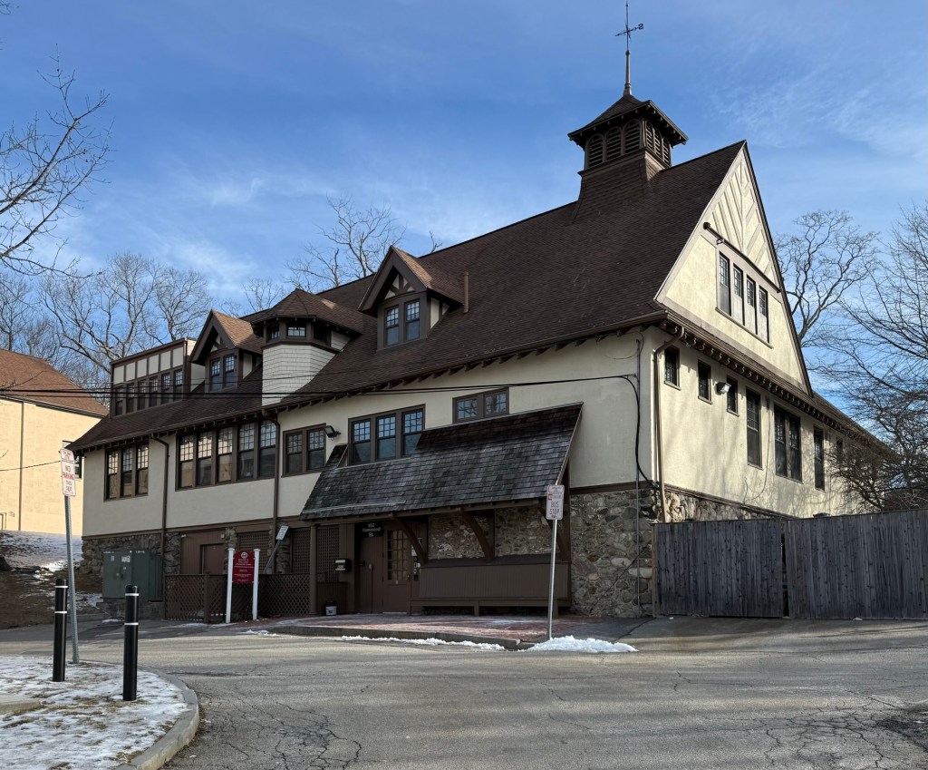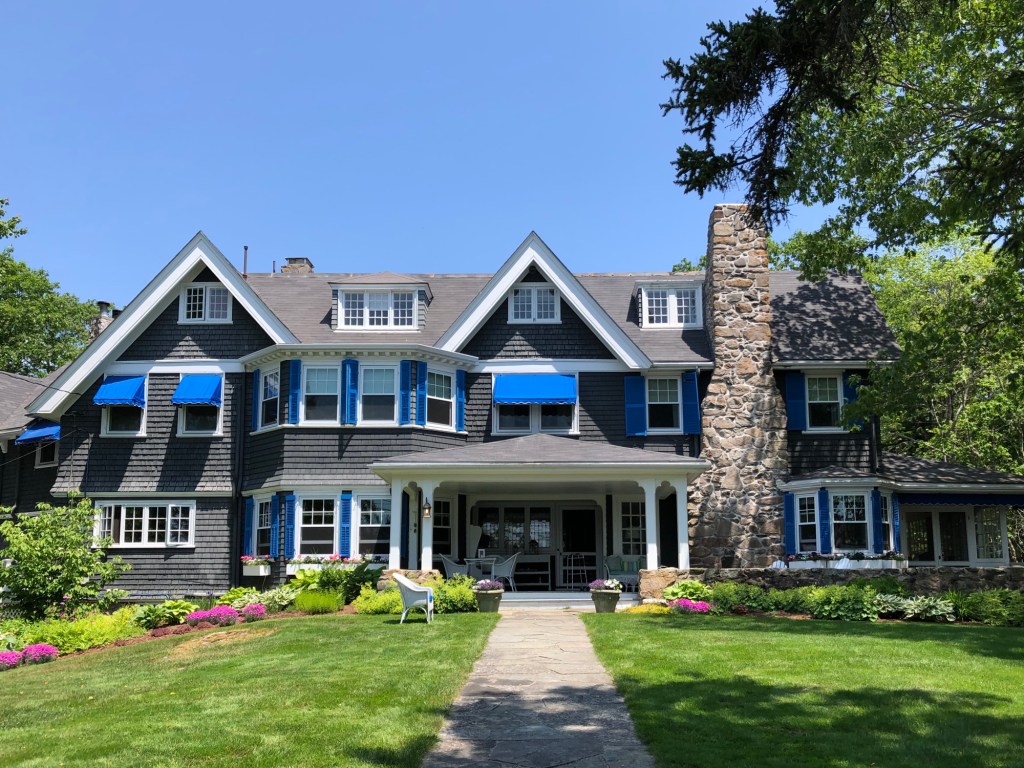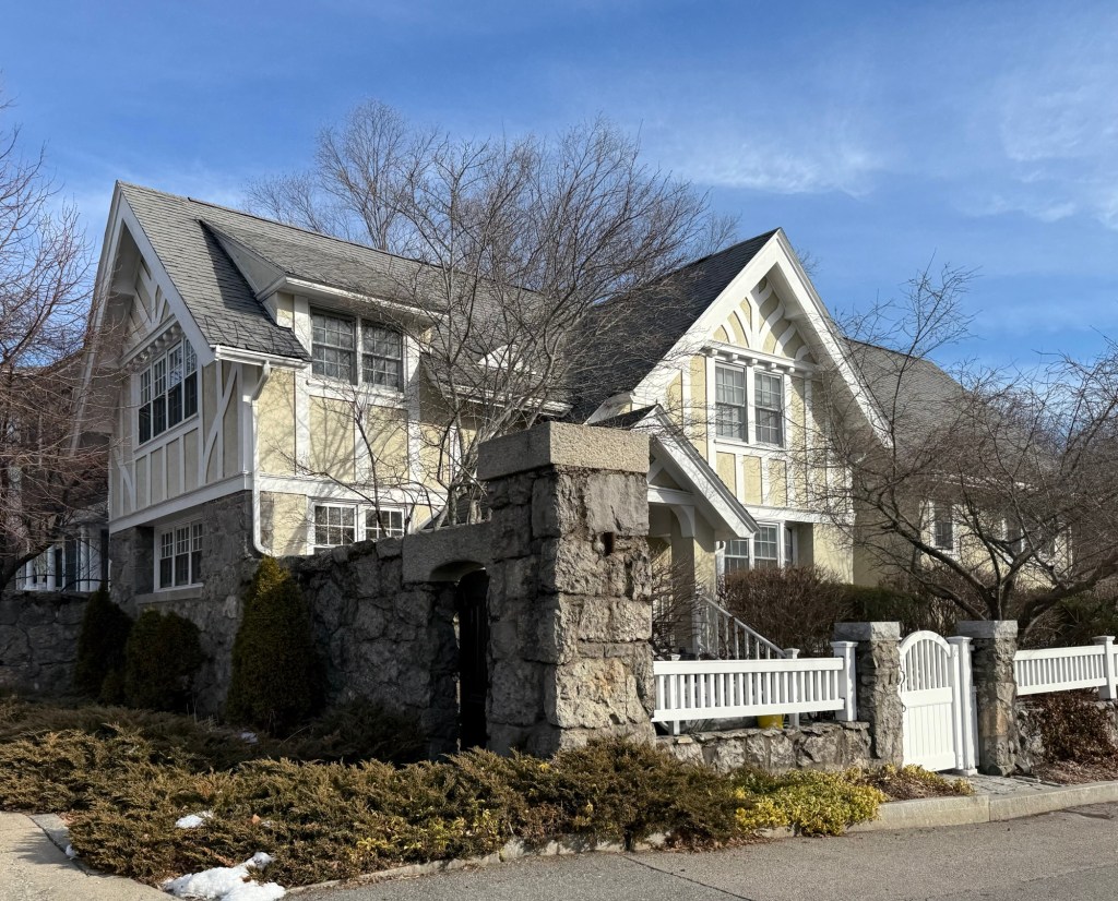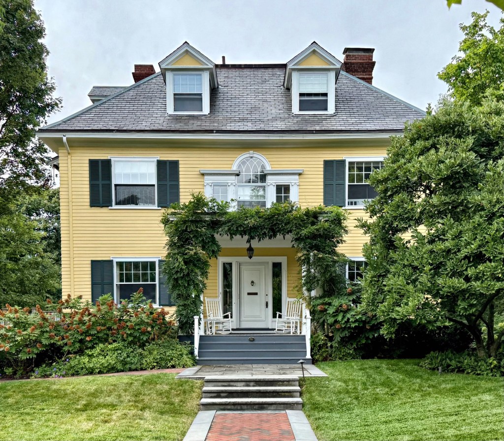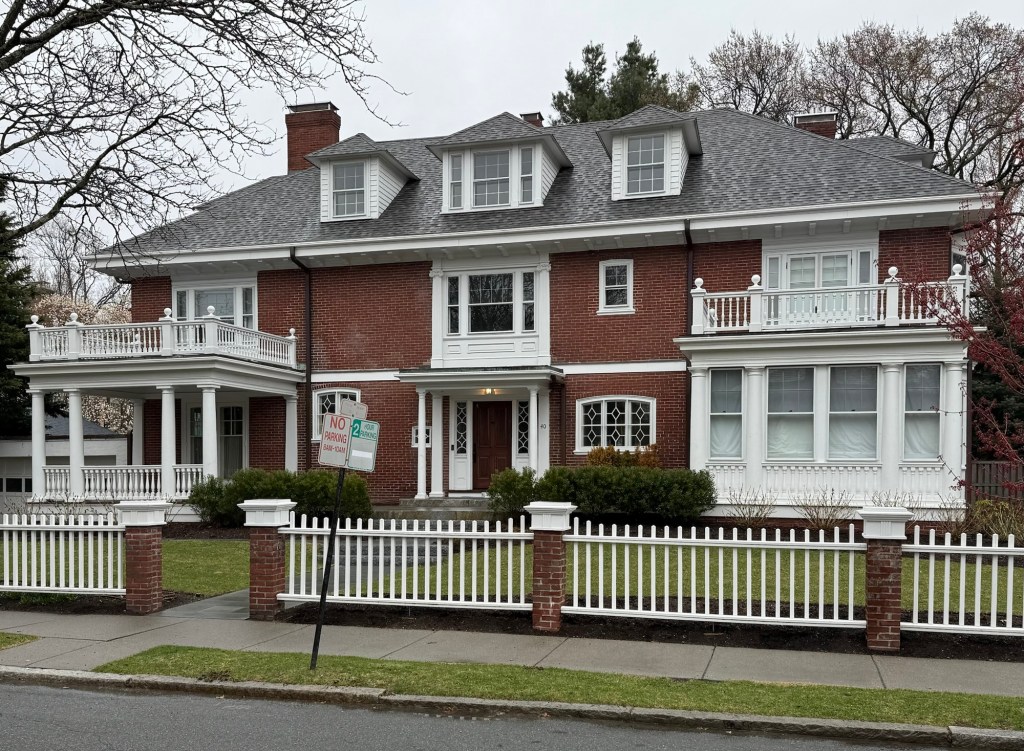 The Dana House at 41 Allerton Street in Brookline, Massachusetts, is one of many stately suburban residences designed in the Colonial Revival style here. Built in 1896 for Ms. Julia Hurd Dana (1825-1914), a widow of James Dana, who was a Mayor of Charlestown between 1858-1860, before it was annexed to Boston. The Dana House was designed by the important architectural firm of Chapman & Frazer, who specialized in higher-end suburban housing at the turn of the 20th century. Julia Hurd Dana was the daughter of William Hurd of Charlestown, and after her husband’s death, moved to Brookline in this new home with her daughter, Mary. The residence is notable for its ample setback from the street, providing a front yard garden, hipped roof of slate with pedimented dormers, and palladian window over the portico which is now covered in crawling ivy.