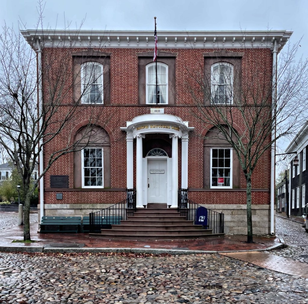 Whaling captains and crew upon returning to the island of Nantucket, would be flush with cash and goods and needed a safe and secure institution to hold their earnings. By the late 18th century, the depletion of the whale population in the Atlantic required whaling vessels to travel further and further in search of oil to fill the barrels in their holds. Ships began sailing to the Pacific and due to the distance, would be out at sea for years rather than months. Money from the Pacific voyages flowed back to the island, which soon required real banking facilities, and the Pacific Bank was established in 1804 and immediately prospered. The bank erected this stately brick building at the end of Main Street Square. Details such as the blind arches filled with sandstone panels that surround the building’s windows, the semi-circular Ionic entry portico and the high brown sandstone stoop with wrought-iron railings are unique on Nantucket and among the finest examples of their type in the region. Also interesting about the building is the fact that it contained living quarters for the cashier whose presence was intended to provide security. The building is now (of course) home to a Bank of America.