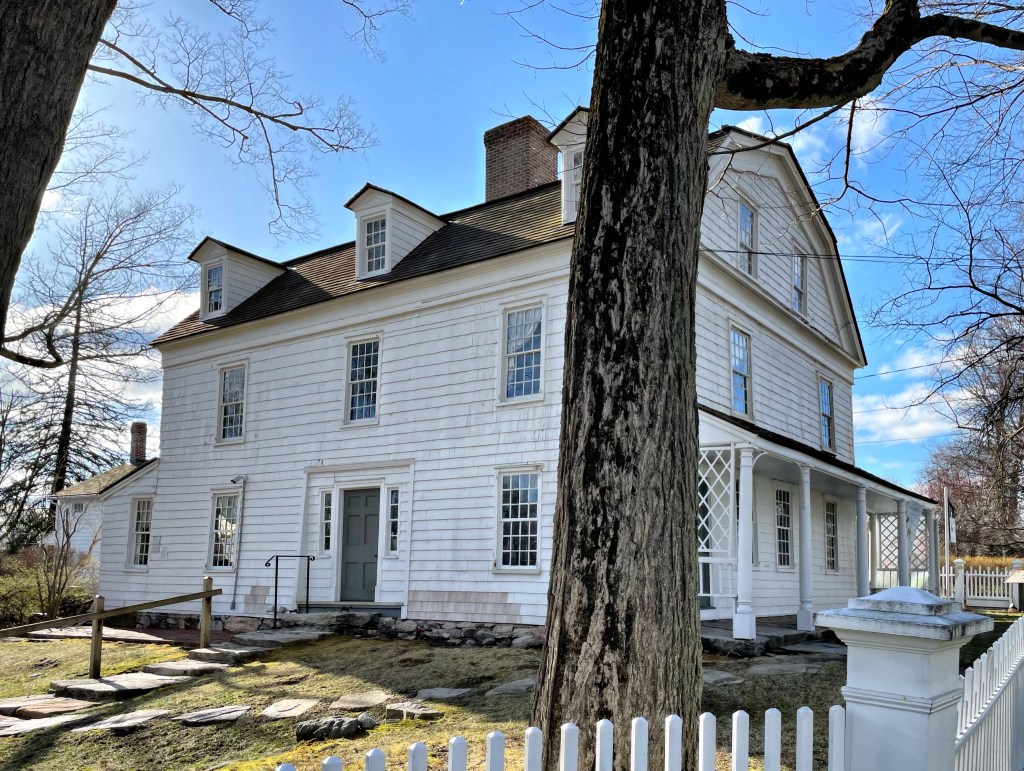 The Grout-Heard House on Cochituate Road in Wayland, Massachusetts, is one of the oldest extant residences in the community and architecturally significant as it shows the evolution of architectural tastes throughout the centuries. The house was built around 1743 for Jonathan Grout (1701-1748), a grandson of an original settler in the area, by the time of his marriage to Hannah Heard in 1743. Early records suggest that the house was originally just one bay deep and two-stories tall with a central entry. The property was sold in 1744 to Richard Heard, Jonathan’s brother in-law. In 1787, Silas Grout (1755-1820), a blacksmith, purchased the house and likely added rooms on the rear of the house. In 1822, Silas’ descendants added the side ell and the residence became a double-house in the mid-19th century. The house was moved from the site to make room for the 1870s Town Hall, and the rounded two-story side bay was added. After the Town Hall was razed in the 1950s, the Grout-Heard house was moved back to its original site in 1962. Since that date the Grout-Heard House has been the offices, research center, artifact repository and house museum of the Wayland Historical Society, who added a two-story Modern addition at the rear.