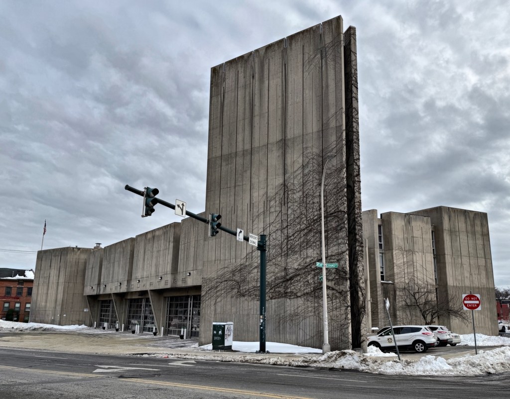 New Haven’s Central Fire Headquarters at 952 Grand Avenue, was constructed in 1961 as part of the Wooster Square Redevelopment Project, a targeted urban renewal plan to revitalize the historic neighborhood. Architect Earl Carlin and his associates, Peter Millard and Paul Pozzi, were hired to design a functional yet streamlined and powerful municipal building to serve as a symbolic gateway into a neighborhood the City wished to revitalize. The fortress-like structure is built of exposed cast-in-place concrete and features strong geometric forms with four corner towers that anchor the main block and vary in height. The fire station’s smooth concrete flanks are scored with subtle vertical grooves which help to provide additional intrigue and depth. Inside, the first level holds space for fire trucks and equipment while the second floor contains office space and the firefighters’ residences. The New Haven Fire Department Headquarters is significant as an early and well-designed example of the often maligned Brutalist style, and as a visual landmark that tells the story of the period of Urban Renewal in New Haven post-war and is holding up quite well!