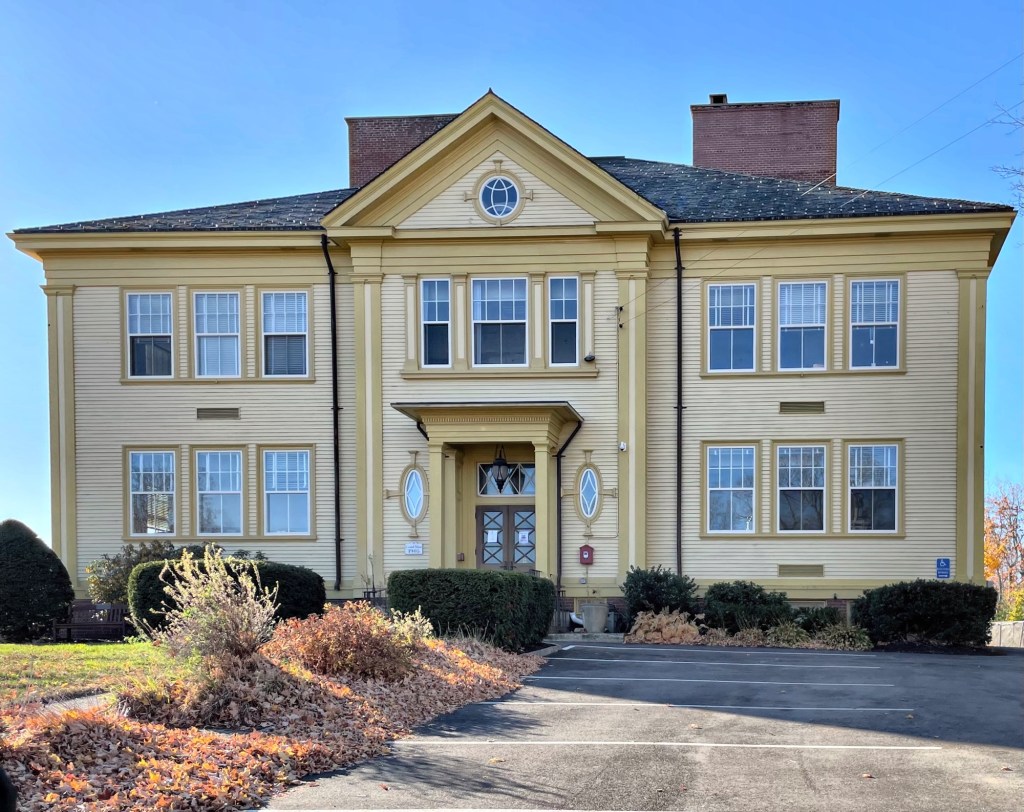 Built a few decades after and located behind the Harvey School in Westborough, Massachusetts, the former Eli Whitney School is a landmark example of an educational building designed in the Neo-Classical style. Built between 1906-7, the school building replaced an earlier school on the site that was outgrown and outdated. Designed by architects Cooper & Bailey, the building stands two-stories tall with a central pedimented pavillion containing the entry that is framed by monumental fluted columns. The school was named after Eli Whitney, the famous American inventor, born in Westborough, who is widely known for inventing the cotton gin in 1793, one of the key inventions of the Industrial Revolution, and later moving to New Haven and manufacturing weapons. When Westborough schools consolidated into modern facilities in the second half of the 20th century, this building was then occupied by the YWCA, and have rented the facilities from the town until it was purchased in 2000.