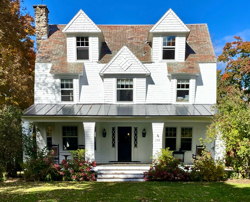 The former Dorset Methodist Church sat on this property from about 1840 to 1900 until they merged with the United Church of Dorset. A Philadelphia physician, Dr. John Herr Musser (1856-1912), built this vacation home in 1906, and passed away just six years later. His widow Agnes Harper Musser (1856-1941) and their children continued to vacation here until after WWII. The home is a rare example of the Shingle style in Dorset and was painted the bright white to fit in with the more traditional New England village vibe, but it would be better-suited with a period- and style-appropriate paint scheme. The home is now offered for short-term/vacation rentals.