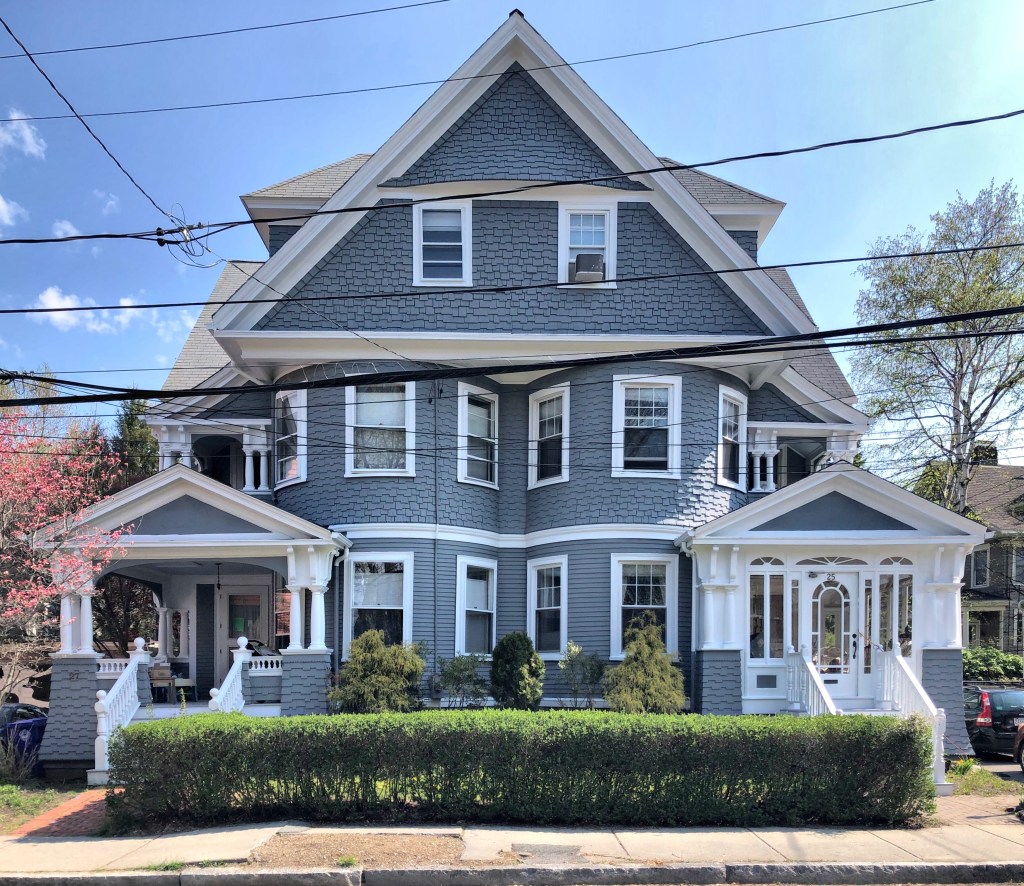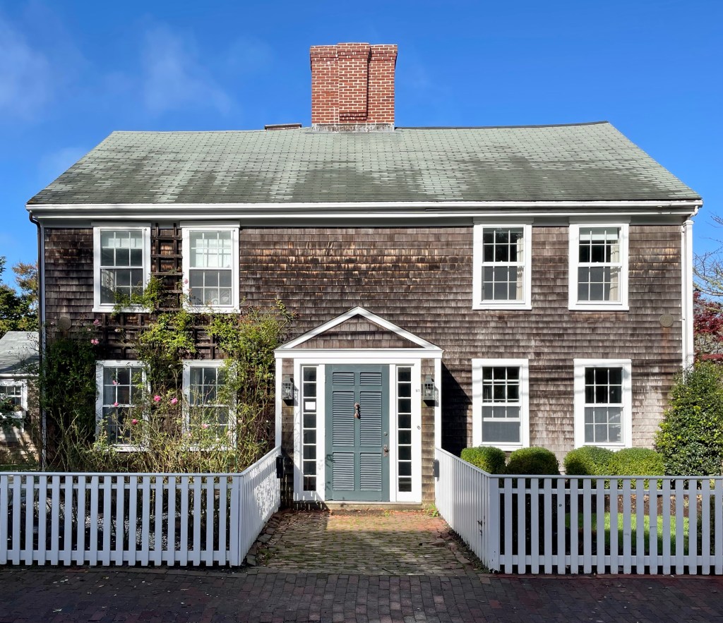 This historic double-house in South Britain village of Southbury, Connecticut was reportedly built around 1752 by Zephania Clark with early residents being an M. M. Canfield and C. Muirhill (both possible renters). The house stands out as a rare example of a double-house from this period in a remote/rural section of town. A later owner, Deacon Mitchell deeded the property to two of his sons, who lived side-by-side in mirror residences. The property was likely “modernized” in the Federal period by Mitchell with the paired chimneys, Federal style entry with sidelights, portico, and tripartite window above the central entrance. It is presently covered in aluminum siding – which is likely preserving the clapboard siding and trim underneath – and a metal shingle roof.