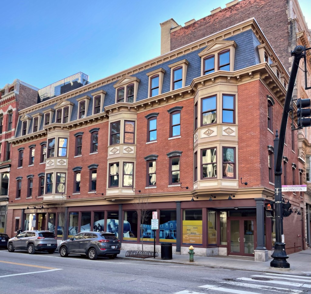 The oldest religious structure on Providence’s west side, the Beneficent Congregational Church is a key Providence landmark. The church visually dominates the part of Downtown that saw widespread demolition in a period of urban renewal, where a large portion of historic buildings and homes were razed for new development and parking. The current structure (the second Meeting House on this location) was built in 1809 to plans by Barnard Eddy and John Newman, the latter of whom supervised construction. It was substantially altered in the Greek Revival style in 1836 to a design by James C. Bucklin, which oversaw the addition of the columns and Classical trim. This work was funded with a $30,000 donation from textile entrepreneur Henry J. Steere in honor of his father. Steere also gave to the church a chandelier containing 5,673 pieces of Austrian crystal! It is not the columns or chandelier that catches people’s attention, it is the massive dome. Legend has it that when designed, Reverend Wilson wanted to recall the domed Custom House in Dublin, which had been dedicated shortly before his emigration to America. The building looks similar to the Massachusetts State House, built in the 1790s, especially when the church’s dome was covered with gold leaf. Due to weather damage to the gold leaf, the congregation voted in 1987 to replace the roof with more durable copper sheeting, which now has a green patina.