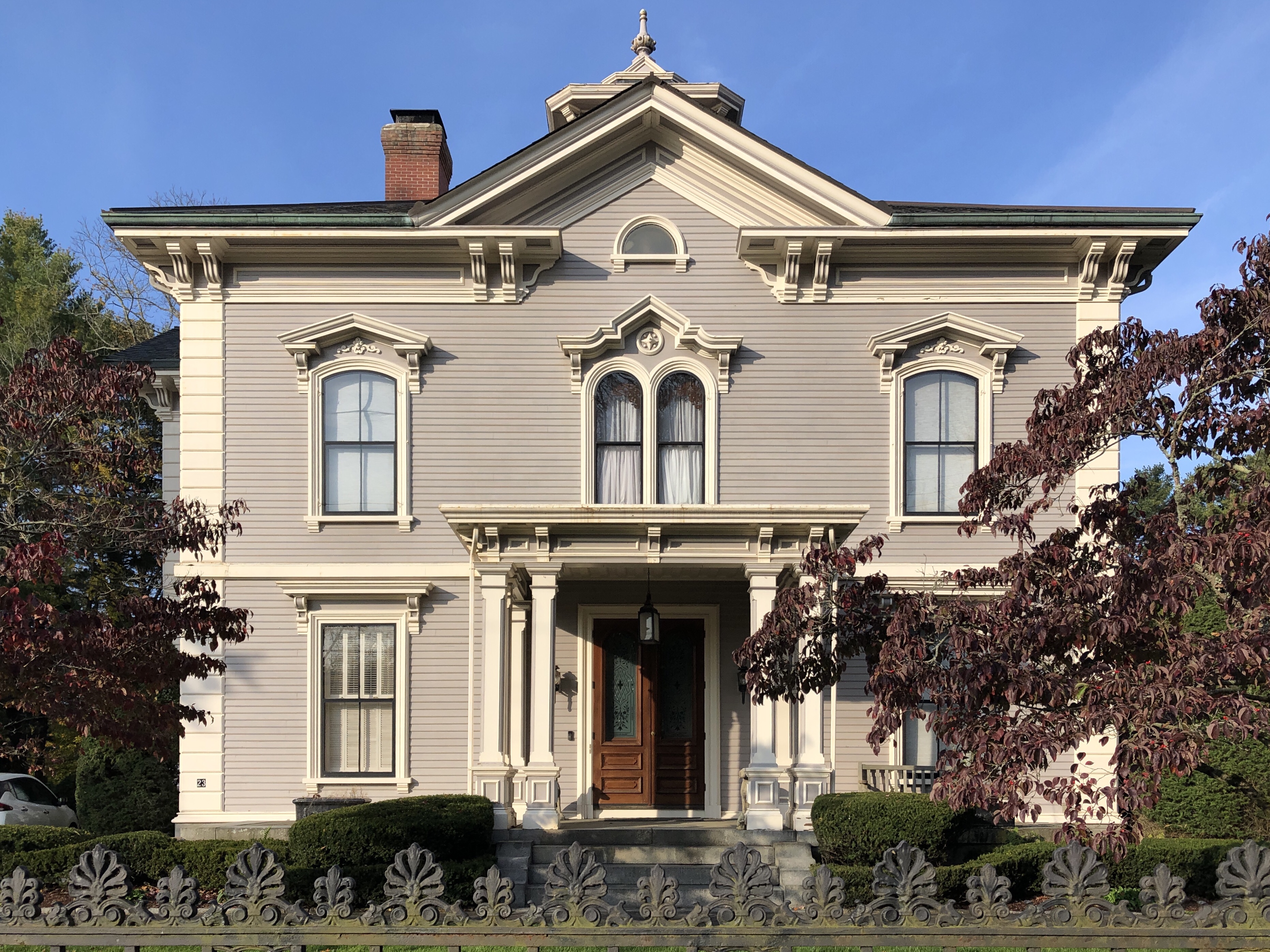 Located on Main Street in Easton, the Oliver Ames Jr. House exemplifies the romanticism of the Italianate style in the mid 19th century. Built in 1864, the home, known as “Unity Close”, was designed by George Snell, a Boston-based architect. Oliver Ames Jr. was a son of Oliver Ames Sr., who along with his brother, Oakes Ames, joined the family business at the Ames Shovel Works in town. The home has a massive garden at the side yard, originally designed by the Olmsted Brothers, John and Frederick, the sons of the great Frederick Law Olmsted.