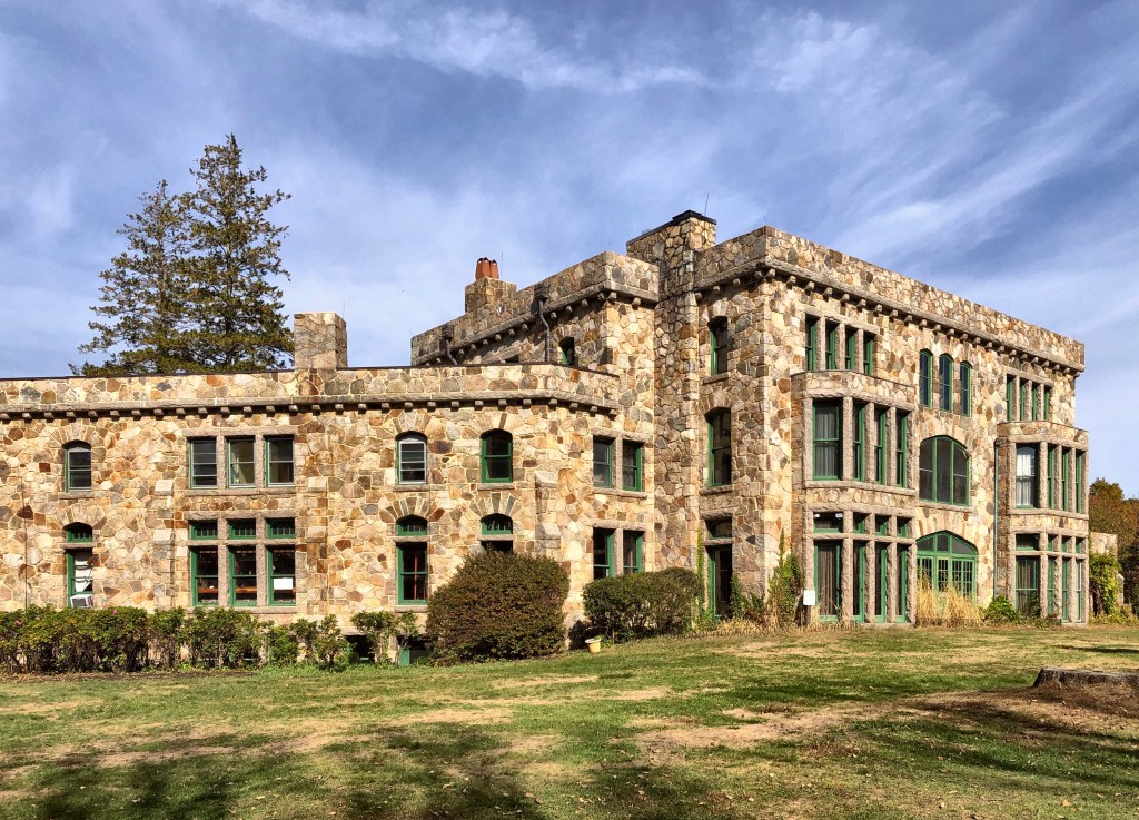 One of the more stunning homes and parks in Massachusetts is located in Easton, known as the Borderland State Park. Borderland was the 1,200-acre estate of Blanche Ames Ames, an artist, political activist, inventor, writer, and prominent supporter of women’s suffrage and birth control. Blanche Ames’ husband, Oakes Ames (of the Ames Family of Easton), came from a wealthy Massachusetts family that owned the Ames Shovel Works. Marrying in 1900, Blanche and Oakes (who were not related even though they had the same last name) constructed their stone mansion in 1910 and created a system of ponds and dams on their property. Blanche and Oakes, who wanted a fireproof house, became displeased with the work of their architect because of the challenges he faced with their design and engineering requirements. Dismissing the architect, Blanche took over the design and construction management of the mansion and hired the Concrete Engineering Company to draw plans according to her specifications. Also on the grounds is a hunting lodge with fireplace, overlooking the large pond on the estate.