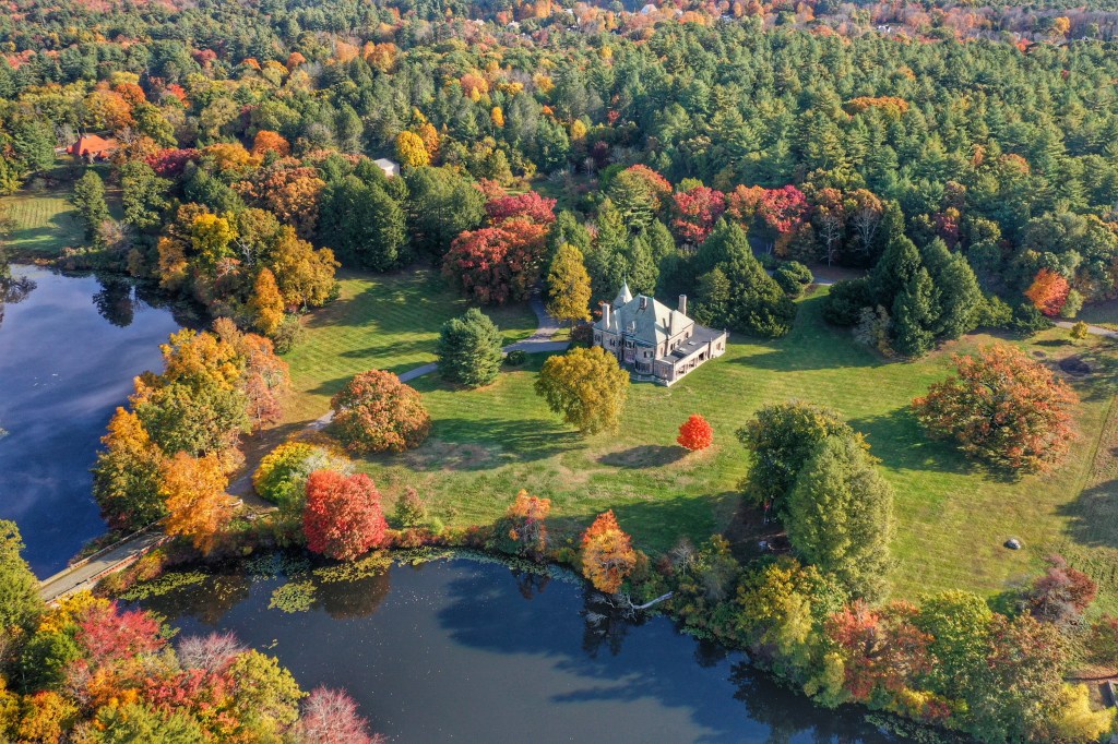One of the more stunning homes and parks in Massachusetts is located in Easton, known as the Borderland State Park. Borderland was the 1,200-acre estate of Blanche Ames Ames, an artist, political activist, inventor, writer, and prominent supporter of women’s suffrage and birth control. Blanche Ames’ husband, Oakes Ames (of the Ames Family of Easton), came from a wealthy Massachusetts family that owned the Ames Shovel Works. Marrying in 1900, Blanche and Oakes (who were not related even though they had the same last name) constructed their stone mansion in 1910 and created a system of ponds and dams on their property. Blanche and Oakes, who wanted a fireproof house, became displeased with the work of their architect because of the challenges he faced with their design and engineering requirements. Dismissing the architect, Blanche took over the design and construction management of the mansion and hired the Concrete Engineering Company to draw plans according to her specifications. Also on the grounds is a hunting lodge with fireplace, overlooking the large pond on the estate.