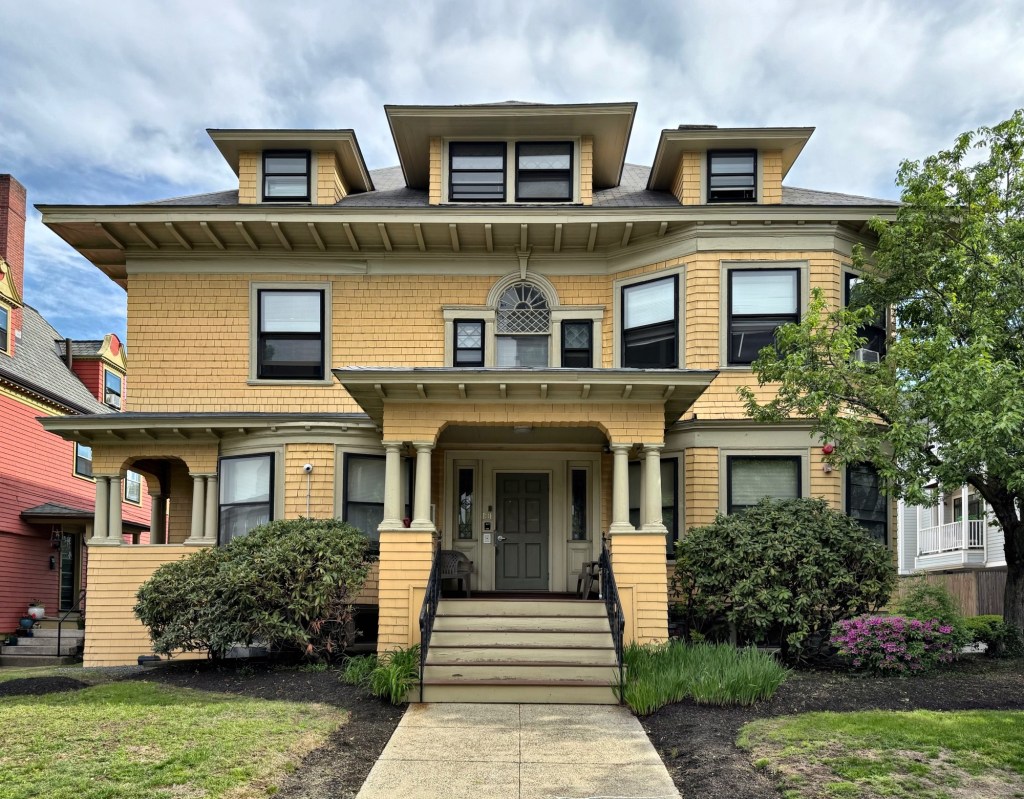 This charming, gambrel-roofed house at the corner of Vinal and Pleasant avenues in Somerville, Massachusetts, was built in 1894 from local developer H. W. P. Colson, and sold upon completion to Mrs. Laura (French) Haley. An architect could not be located. Laura Haley was recently widowed and lived in the house with her daughter, with her son purchasing the house next door. The Haley House is notable for its gambrel roof with gambrelled center gable, pilastered dormers, stained glass windows, and full-length porch with columns and rubblestone base. The well-preserved house blends Queen Anne and Colonial Revival styles under one broad roof. It is magnificent!