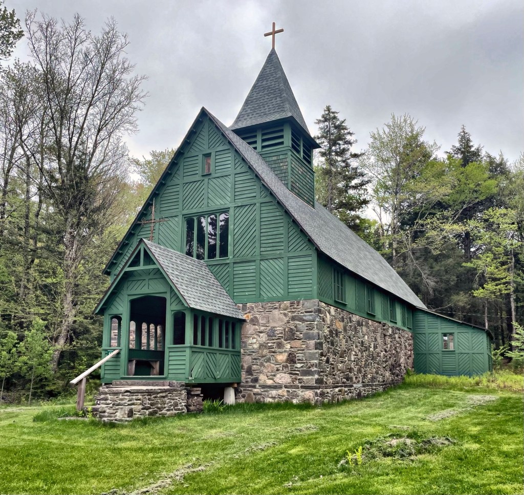The Memorial Church of All Angels is located in the center of the summer colony of Twilight Park, found in the town of Hunter in the Catskill Mountains. The founding of the church began shortly after the colony was established in 1888, when two years later, the Rev. H. M. Baum from Evanston, Pa., an early visitor to the Park, realized the need for an Episcopal Church, and funds were raised to build a small chapel, known as the St. Paul’s Church. The church was foreclosed upon in a matter of years. In 1895, church services were again reinvigorated when the Rev. Henry Yates Satterlee, the first bishop of Washington, then the Rector of Calvary Church, New York, had taken the cottage of his cousin, the artist Walter Satterlee, for his summer home. He set out to establish a summer chapel for Episcopalians in Twilight Park, and he hired architect Alexander Mackintosh, to furnish plans for the church. The church opened in 1896, and it would be expanded in 1909 with an addition and porch and again in 1915 with the belltower. The church opens every summer for services and is one of the finest Episcopal chapels in the Northeast.