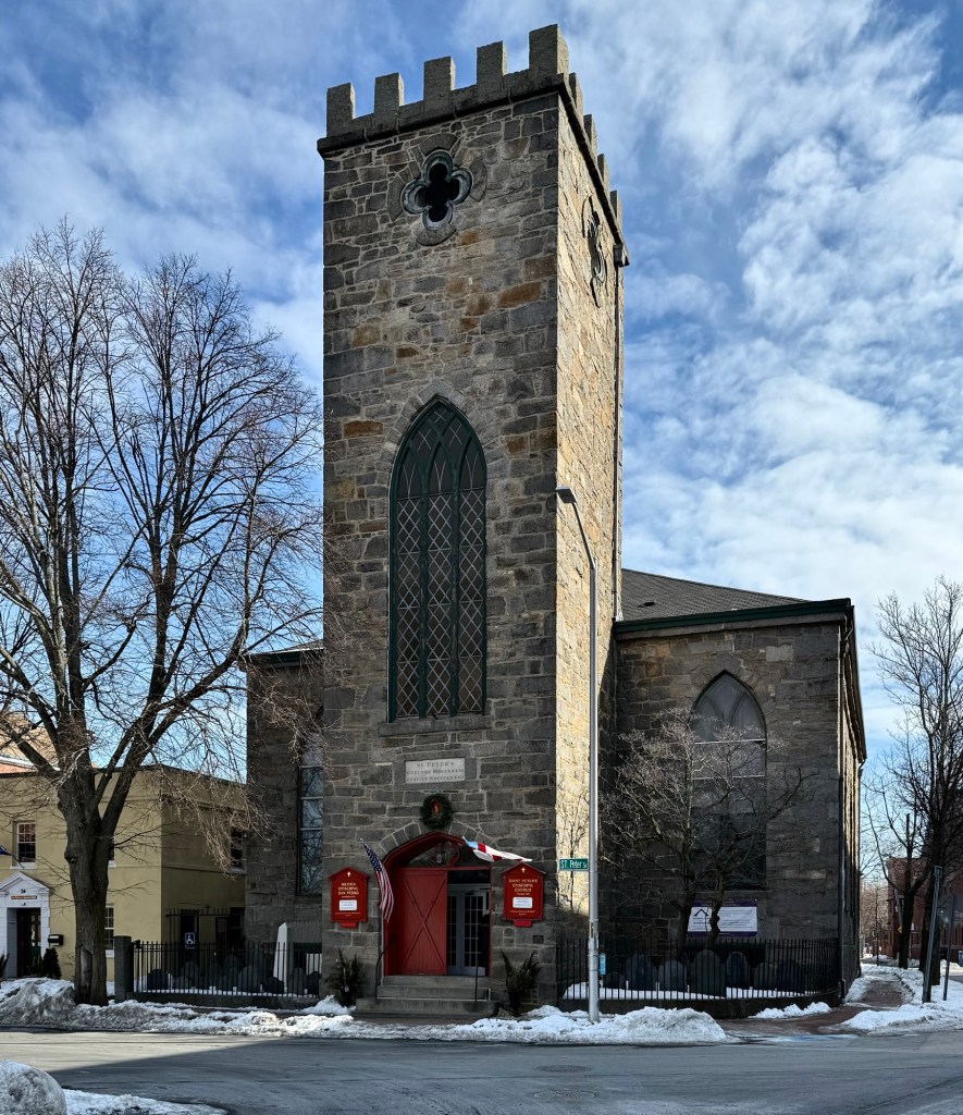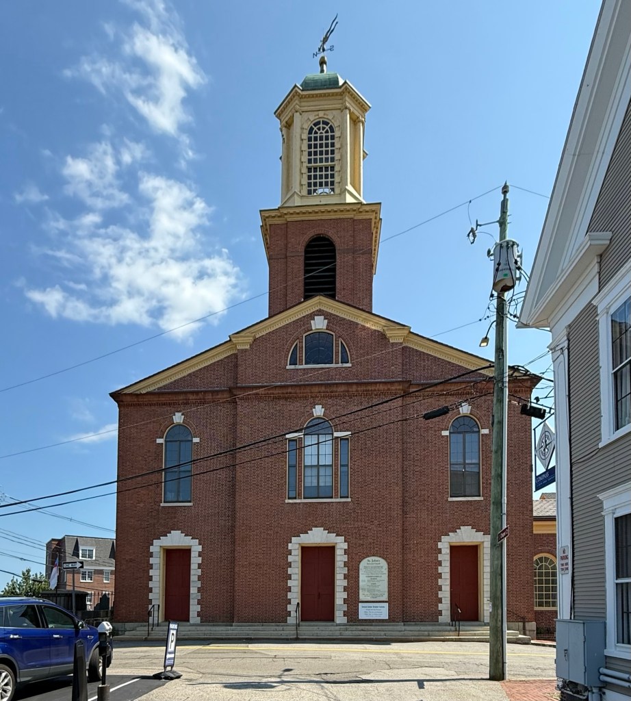 St. John’s Episcopal Church is located on Chapel Street, atop Church Hill near the historic commercial center of Portsmouth, New Hampshire. A church has been located on this site since 1732, when British Anglicans built Queen’s Chapel here. It was named “Queen’s Chapel” after King George II’s wife, Queen Caroline, who donated many fine gifts to help the new parish. The congregation increased in growth alongside the community until a tragic fire on Christmas Eve in 1806, which destroyed over 300 buildings in Portsmouth including the original wooden structure of St. John’s and most of its contents. The parishioners immediately began to raise funds to erect the present brick church, with its cornerstone laid in June 1807. The Federal style church was one of the first known buildings by architect-engineer, Alexander Parris, in the time before he moved to Boston, designing many iconic buildings there. St. John’s Church of Portsmouth stands as the oldest Episcopal Parish in New Hampshire and was individually listed on the National Register of Historic Places in 1978.