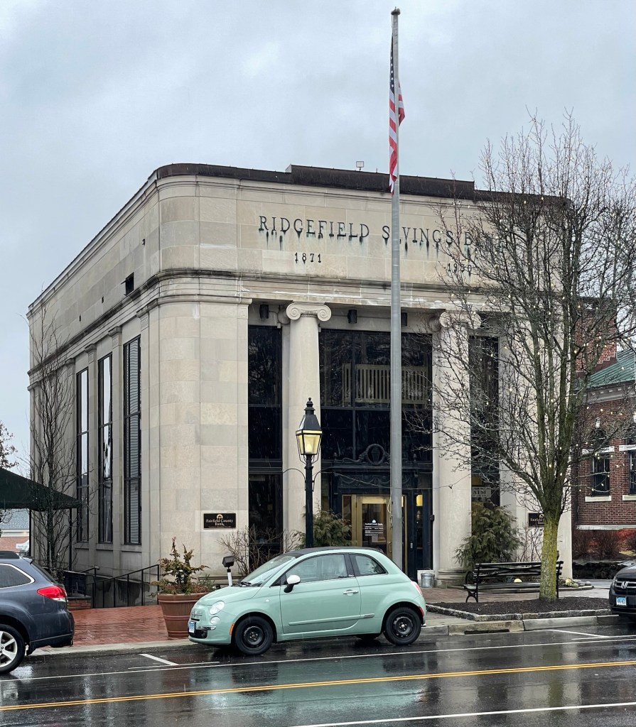 Historically, bank buildings were built with architecture at the forefront to show members and prospective investors that their company instilled prosperity and longevity. Today, many new bank buildings are cookie-cutter designs and lack ornamentation or intrigue… The interwar Ridgefield Savings Bank on Main Street in Ridgefield, Connecticut, was built in 1930 from plans by architects Ralph Hawes and Ernest Strassie in the Neo-Classical style with Art Deco rounded corners and undecorated planes. Dominated by its Classical Ionic portico the bank building is a lasting commercial landmark on the town’s charming Main Street. It is now occupied by the Fairfield County Bank.