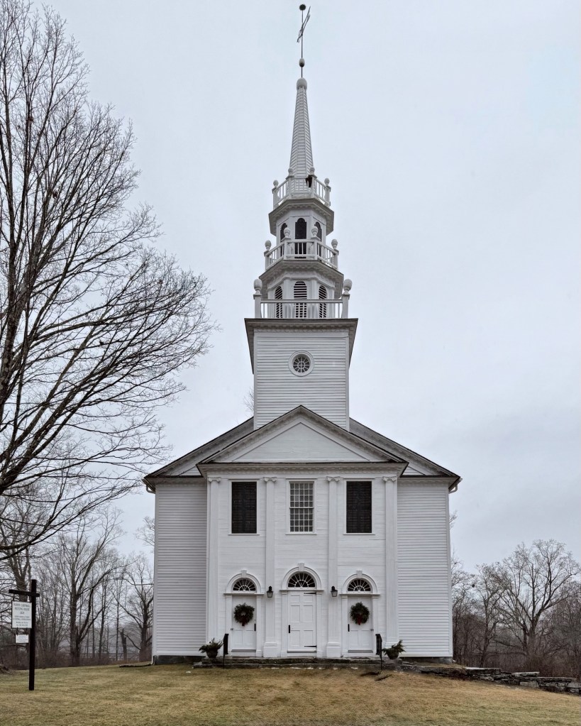 The First Parish Church of Wayland, Massachusetts, is an iconic church that displays the typical early 19th-century meetinghouse form with Federal-style elaboration. Built in 1814, the church is two-stories with a five-bay gabled-front structure with a projecting enclosed portico of three entrance bays, and a four-stage bell tower that rises above the façade. Today known as Wayland, the town was originally called East Sudbury, after it split away from the western parish in 1780. In 1835, members of town meeting voted to rename East Sudbury “Wayland” in honor of Dr. Francis Wayland, a temperance advocate, abolitionist, and then president of Brown University. The First Parish Church of Wayland was built by Andrews Palmer of Newburyport, who used an Asher Benjamin design. The bell was cast by Paul Revere and Sons and first lifted into the bell tower in 1814. The property also includes the historic, twelve-bay horse/carriage sheds where parishioners would “park” their horses and carriages while attending services.