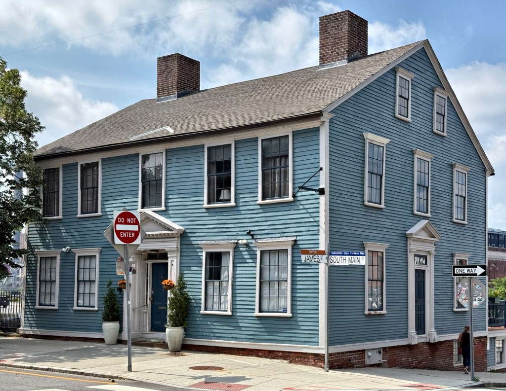 This Georgian house at 403 South Main Street in Providence’s East Side was built by Captain Joseph Tillinghast (1734-1816) a wealthy merchant and participant in the Gaspee Affair, a significant event in the lead-up to the American Revolution. The Gaspee Affair occured in 1772, when a group of men from Providence attacked and burned the British customs schooner, HMS Gaspee. The incident was fueled by colonial resentment towards British customs enforcement, and took place not too long after the Boston Massacre. Joseph built this house for his family on land he inherited from his family, who claimed the land in 1645. Tillinghast was also the owner of a line of packet boats (light shipping of domestic freight and mail) operating between Providence and Newport. After Joseph died in 1816, the property was occupied by members of the Tillinghast family until 1847. By the mid-20th century, urban renewal and the proximity to the new highways caused the surrounding area to suffer, with this historic home threatened. Throughout 2008, the building’s condition continued to rapidly deteriorate, and local preservationists advocated for the home’s future. After attention was brought to the residence and its significance, the house was restored with the assistance of the Providence Revolving Fund, including the stabilization of the foundation, roof and chimneys rebuilt, with clapboards and windows repaired.
