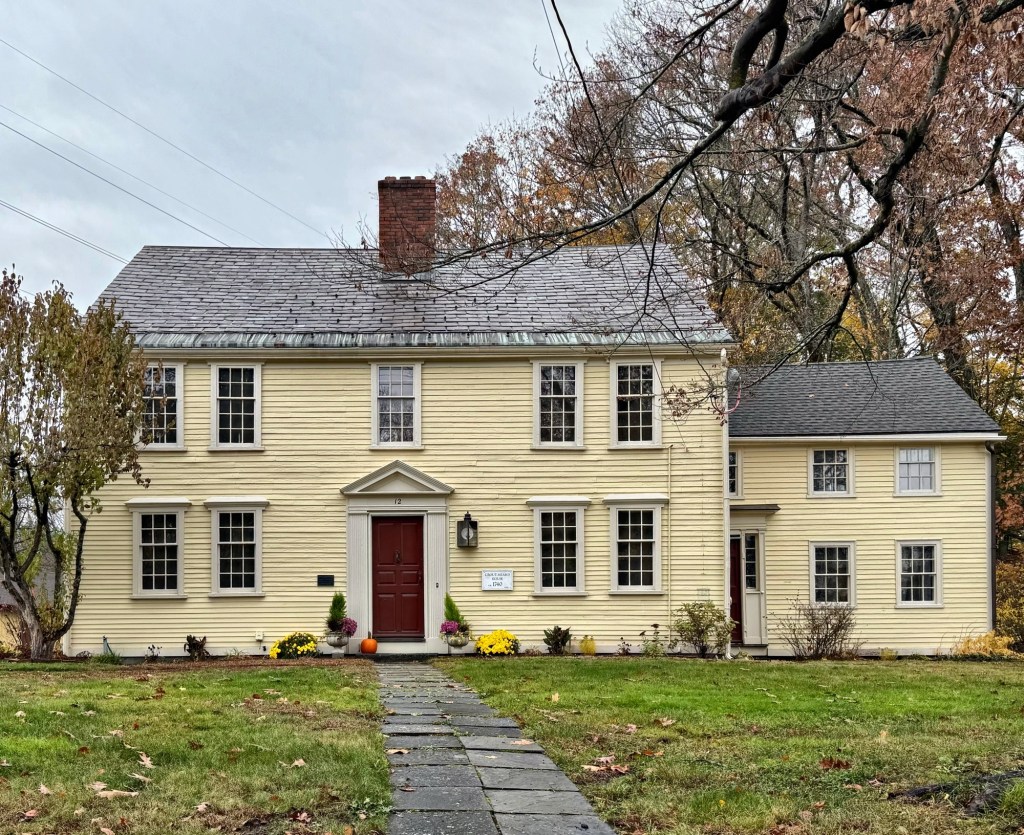 The Grout-Heard House on Cochituate Road in Wayland, Massachusetts, is one of the oldest extant residences in the community and architecturally significant as it shows the evolution of architectural tastes throughout the centuries. The house was built around 1743 for Jonathan Grout (1701-1748), a grandson of an original settler in the area, by the time of his marriage to Hannah Heard in 1743. Early records suggest that the house was originally just one bay deep and two-stories tall with a central entry. The property was sold in 1744 to Richard Heard, Jonathan’s brother in-law. In 1787, Silas Grout (1755-1820), a blacksmith, purchased the house and likely added rooms on the rear of the house. In 1822, Silas’ descendants added the side ell and the residence became a double-house in the mid-19th century. The house was moved from the site to make room for the 1870s Town Hall, and the rounded two-story side bay was added. After the Town Hall was razed in the 1950s, the Grout-Heard house was moved back to its original site in 1962. Since that date the Grout-Heard House has been the offices, research center, artifact repository and house museum of the Wayland Historical Society, who added a two-story Modern addition at the rear.