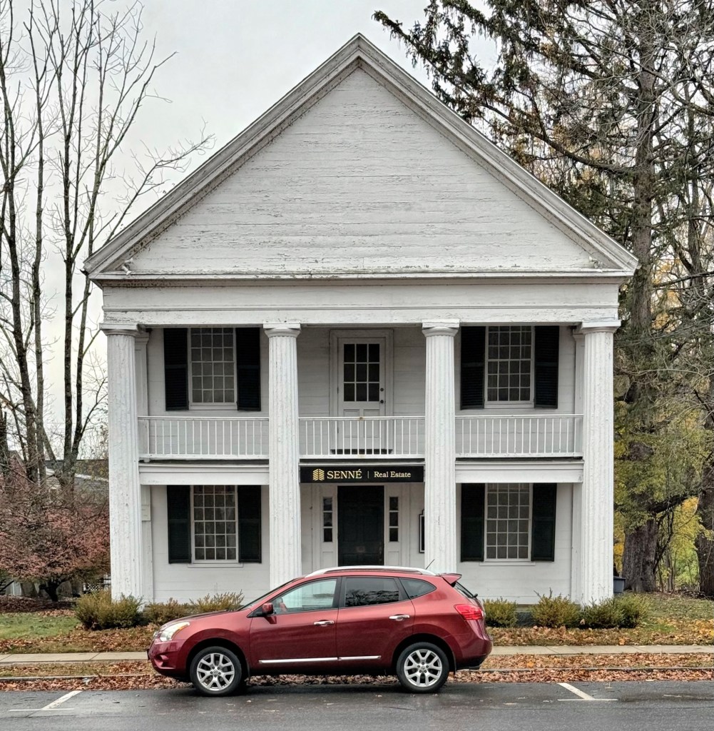 Colloquially known as the “Stone Store,” this handsome stone structure in Chester Village, Connecticut, was built by William Buck in 1809, a merchant involved in the West Indies trade. The stone for the building is believed to have come from the Chester quarry in town and was likely more vernacular without the columned portico. The four-columned Doric portico was likely added in the 1830s or 1840s as the Greek Revival style surged in popularity. The two side wings were added in the 20th century. The Old Stone Store has held various uses from a store, tavern, post office and liquor store, while the upper floor has served as a private school, the town’s library and an apartment. The Old Stone Store today acts as the western terminus of the town’s Main Street commercial district.
