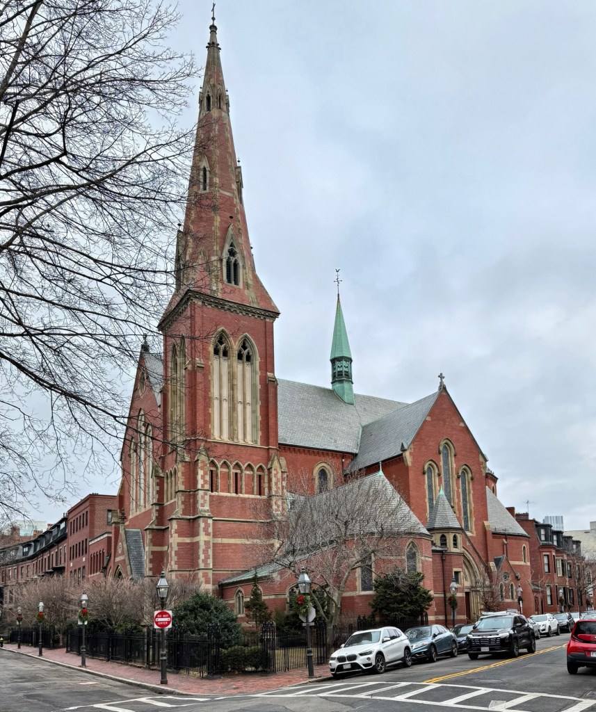 The Church of the Advent in Beacon Hill, Boston, is a landmark example of a church designed in the Victorian Gothic style with strong English influence. The congregation, established in 1844, purchased a large corner lot at Brimmer and Mount Vernon streets on the newly made filled land west of Charles Street in Beacon Hill Flat, to construct their new church. In 1875, John Hubbard Sturgis, a Boston architect and parishioner, began designing the red brick with sandstone-trimmed church set on a corner lot with dominant corner tower and octagonal steeple. Construction began in phases beginning in 1878 and took years until the steeple was completed in 1888. Before its completion, John H. Sturgis died and his nephew, Richard Clipston Sturgis, oversaw the completion of the church, which became somewhat of a memorial to his late uncle. Following the completion of the Church of the Advent, Sturgis’ widow, extended family and clients donated a major portion of the interior art, stained glass windows, and furnishings. The polychromatic exterior in red and charred brick mixed with sandstone trim appears to have been inspired by his designs for the original Boston Museum of Fine Arts (1876, demolished in 1911.) The Church of the Advent in Boston is one of the finest ecclesiastical buildings in New England and is the master-work of one of America’s great architects.