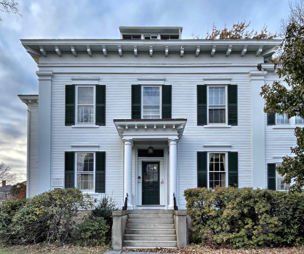 Located in the western part of the East Village of Wilton, New Hampshire, this stunning Italianate manse stands out as one of the most architecturally grand in the area. The home was built for David Gregg (1816-1880), a merchant who was engaged in lumber dealing in Michigan as an investment. His company was based out of Nashua and manufactured wooden blinds, doors, window sashes and was co-owned by David and his son, David Jr. David was likely retiring from business by the late 1860s and built this large home on a hill outside the village. At about this time, he became involved with local politics, which he was involved with until his death in 1880. The Italianate style home features round arched windows, brackets, a belvedere at the roof, and what appears to be an attached, converted carriage house. The home was eventually turned into a bed and breakfast, but it has since been converted back to a private home.